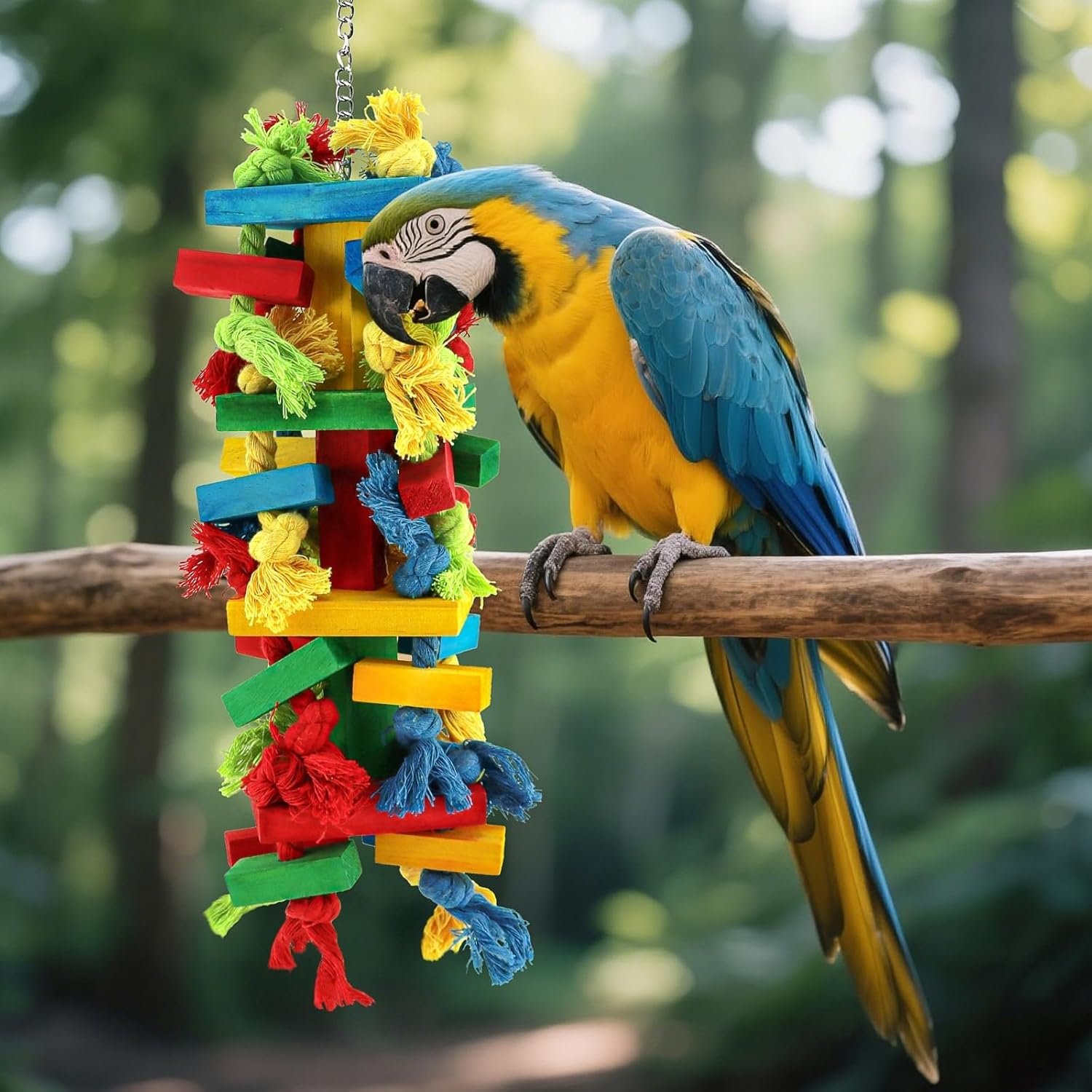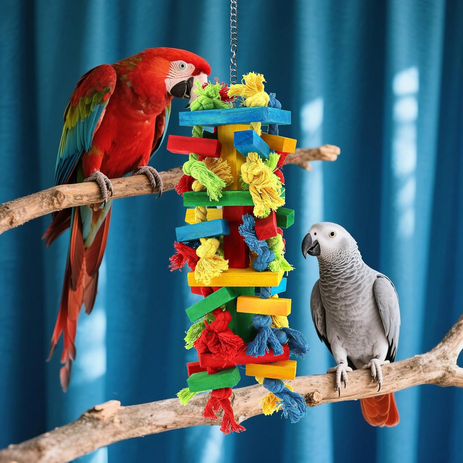 My Macaw has spent the first day inspecting the toy with wide happy eyes, then spent 2–3 hours nightly tugging and shredding. Within a week, it became her favorite chew toy, installation is quick with the quick-release stainless clip attaches to any cage bar in seconds, and it’s affordable enough to swap out the worn blocks or ropes without replacing the entire toy.