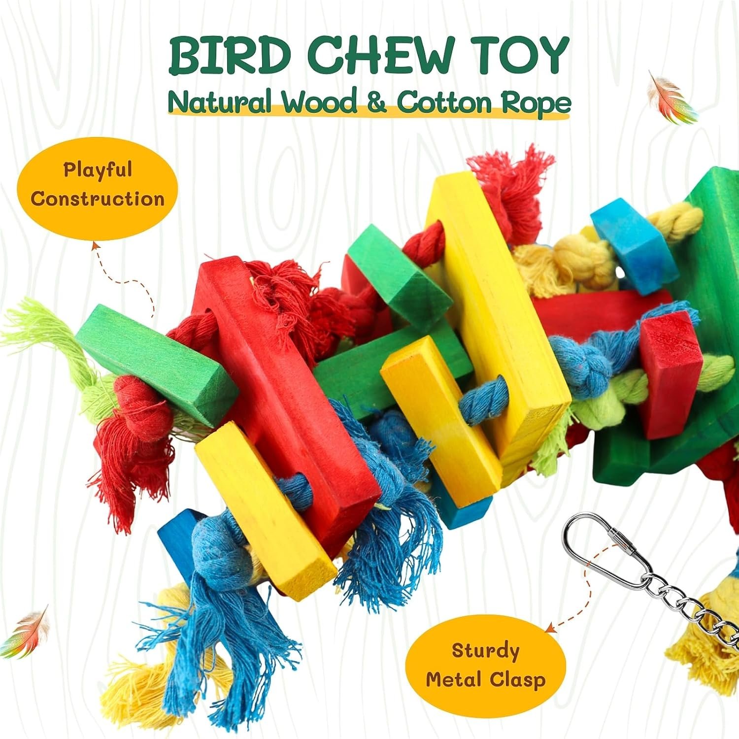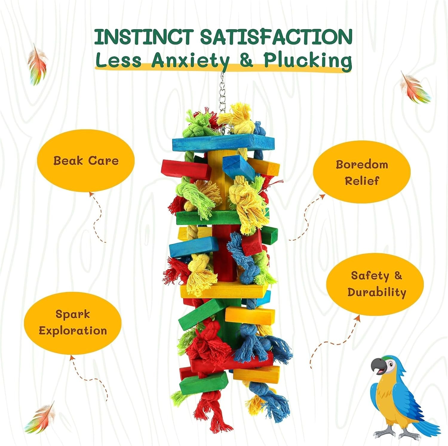 • Enriches avian life and satisfies instincts through chewing blocks, pulling ropes, and manipulating parts
