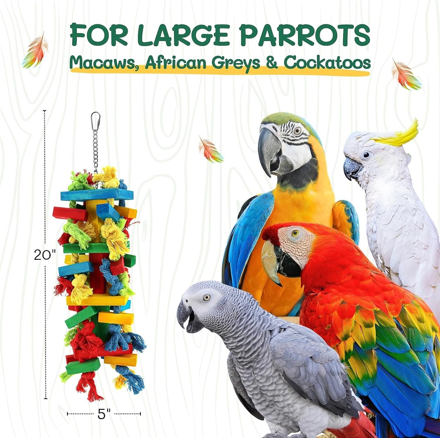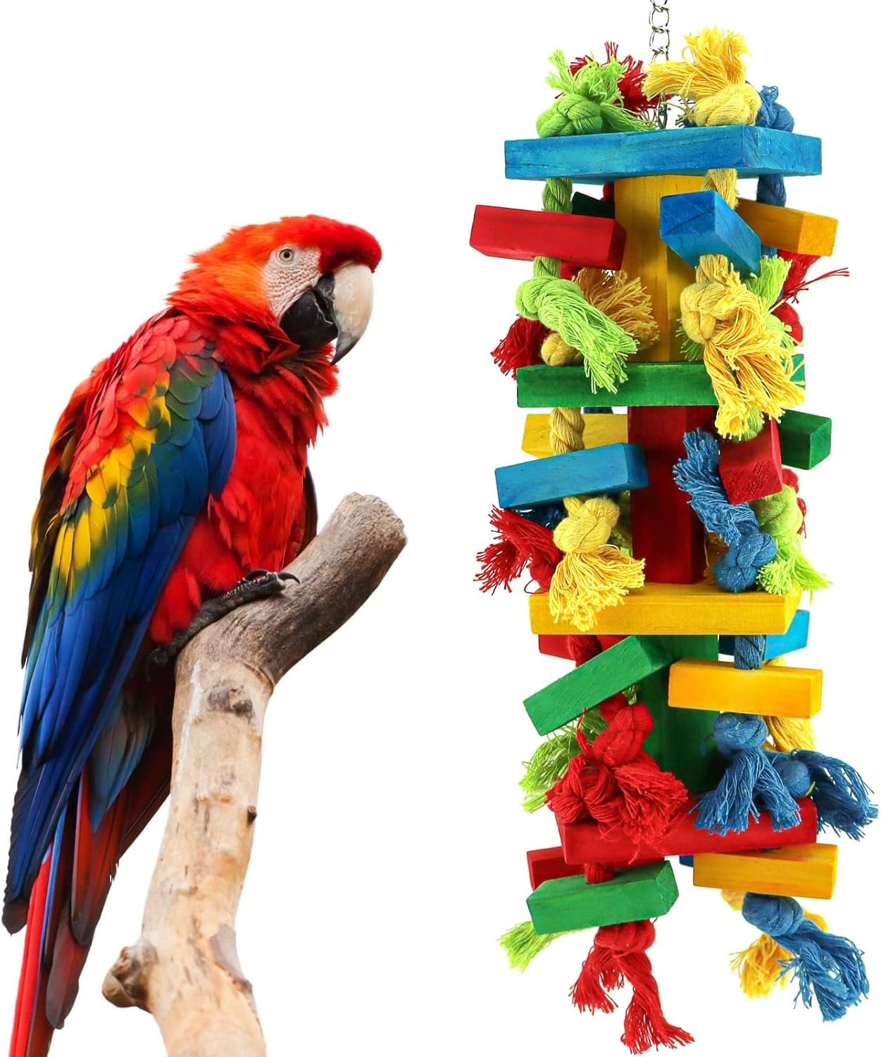 This bird toy is designed to provide entertainment and stimulation for large parrots, such as macaws, African greys, and cockatoos. The toy features a vibrant mix of wooden blocks and cotton rope, making it easy for your avian companion to wiggle, explore, and chew. It helps to reduce anxiety and unwanted behaviors like feather plucking, keeping your parrot entertained and engaged.