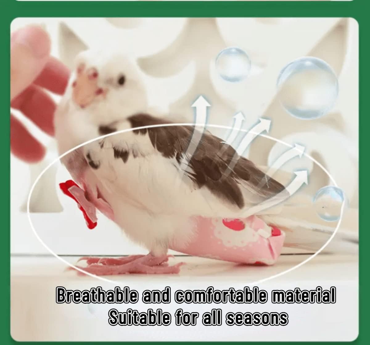 Your bird may not adapt to the cloth immediately, and may try to bite or remove it. Please be patient and stop your bird from biting the cloth. With time, your bird will become comfortable wearing the diaper.