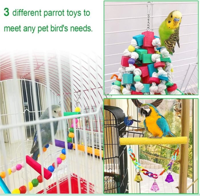 - Package Includes: 3 different parrot toys designed to meet any pet bird’s needs.