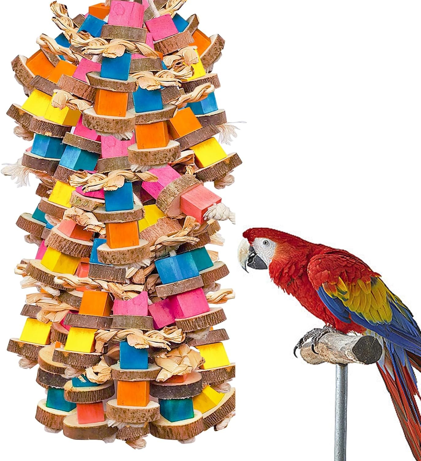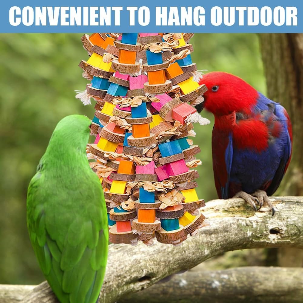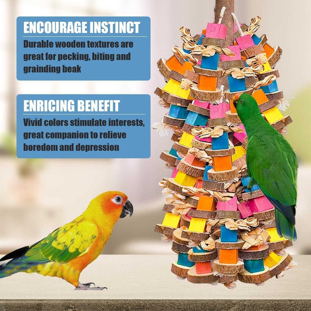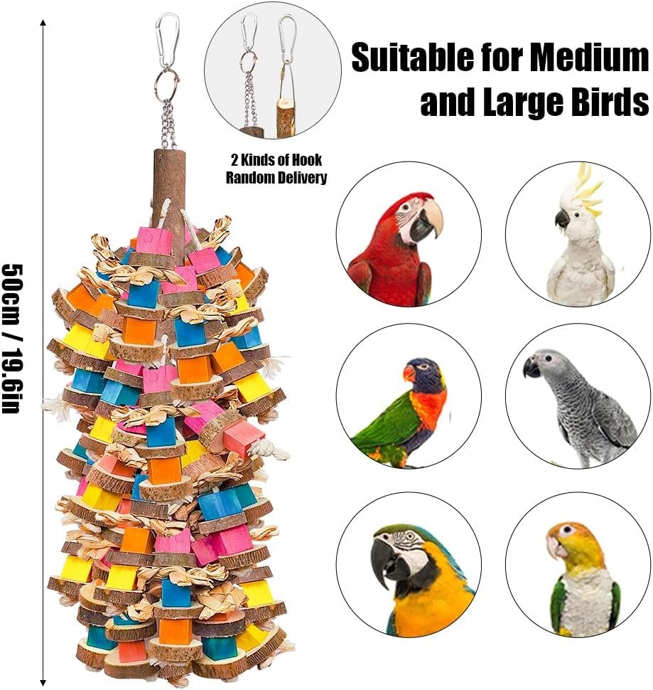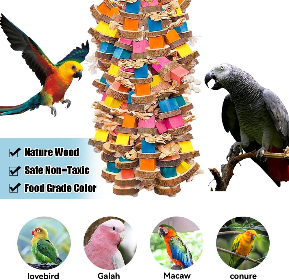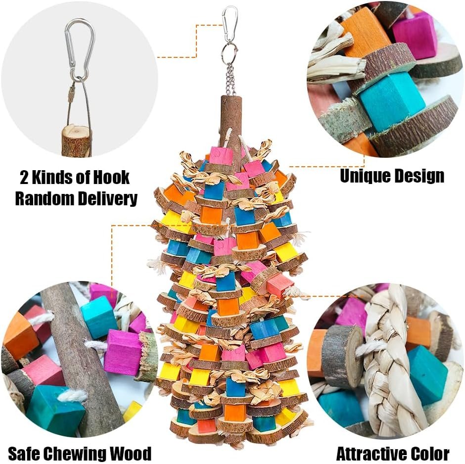 Our parrot toys for large birds measures 18" with colorful wood block, making it suitable for various parrot species. The large parrot toys easily grab a parrot’s attention, keeping them busy and reducing damage to household items. You can also make it the perfect gift for family or friends who have parrots.