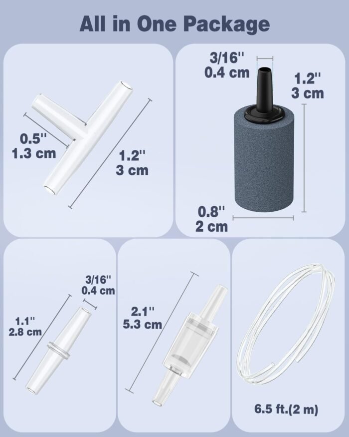 • Accessories: 6.5-foot 3/16" airline tubing, 2 small air stone cylinders, 2 connectors, and 2 check valves