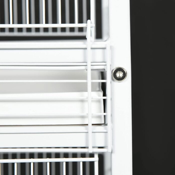 This bird cage with stand is designed to provide a comfortable and spacious living space for your feathered friends. It includes large front doors and multiple sliding food doors for easy access to your birds’ food and water. The bottom shelves can be used for storing pet supplies.