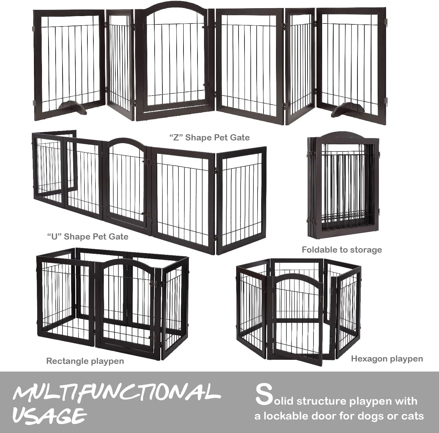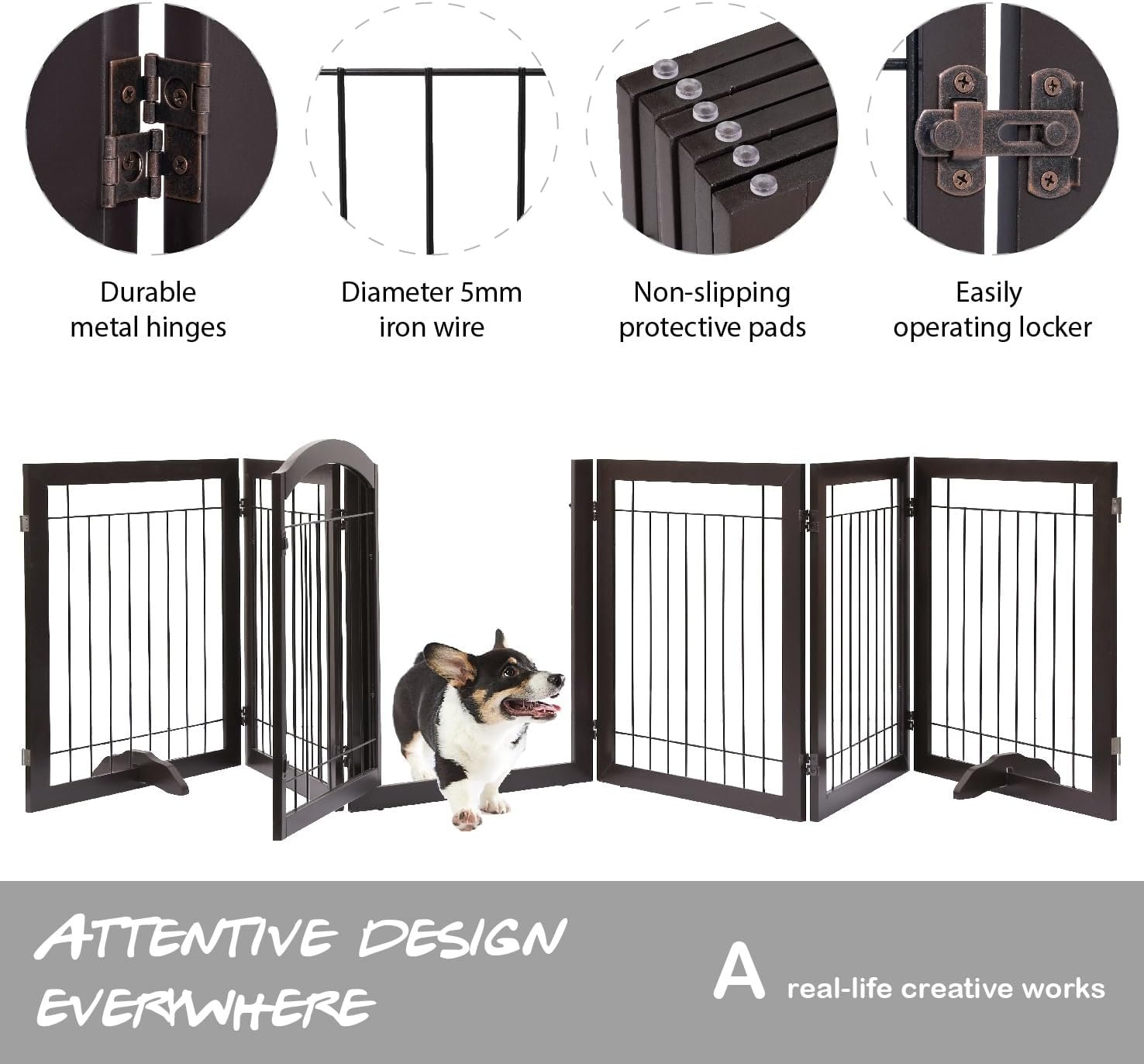 This dog gate is designed to provide a safe and secure way to keep your pets contained in a specific area of your home. The gate is freestanding, meaning it does not require any wall attachments, and is lightweight, making it easy to move and store.