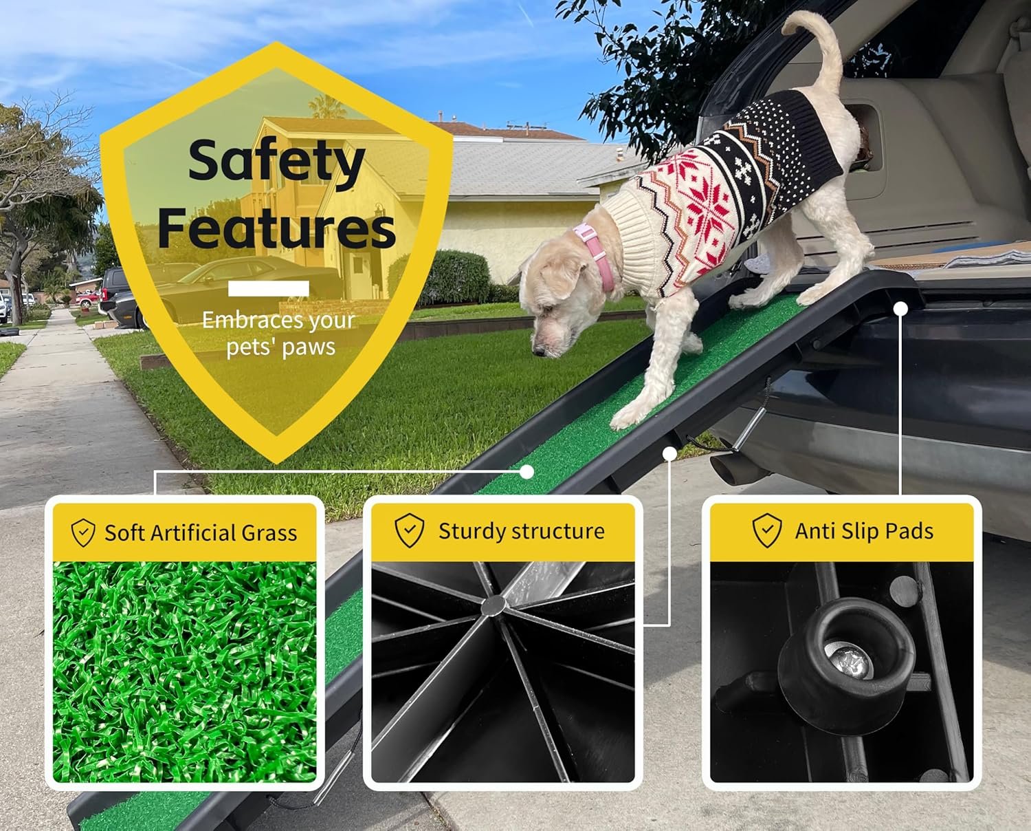 • Enhanced Paw Grip: The ramp’s surface, adorned with soft artificial grass, embraces your pets’ paws, providing a comforting and secure grip.