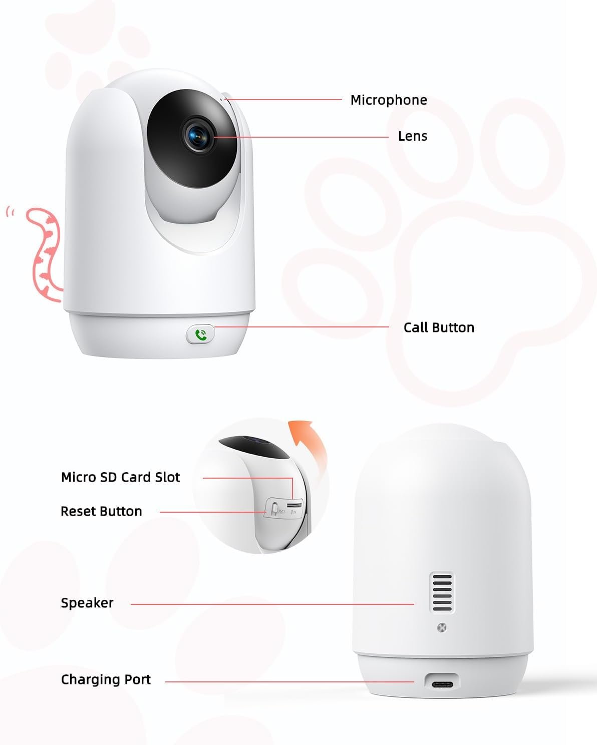 - One-Touch Call & Two-way Talk: The camera has a one-touch call button for instant connection when needed, and a two-way talk feature that allows interaction with pets while away.