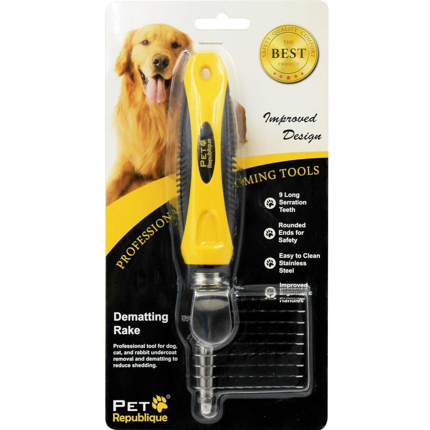 The Pet Republique dematting rake is designed for effective de-matting of even the longest and densest coats of dogs, cats, rabbits, and long-haired breed pets. Featuring 9 serrated teeth, it efficiently tackles tough mats while offering a safe and gentle grooming experience. The sharp blades are paired with rounded outer edges, making it safer than traditional mat combs.