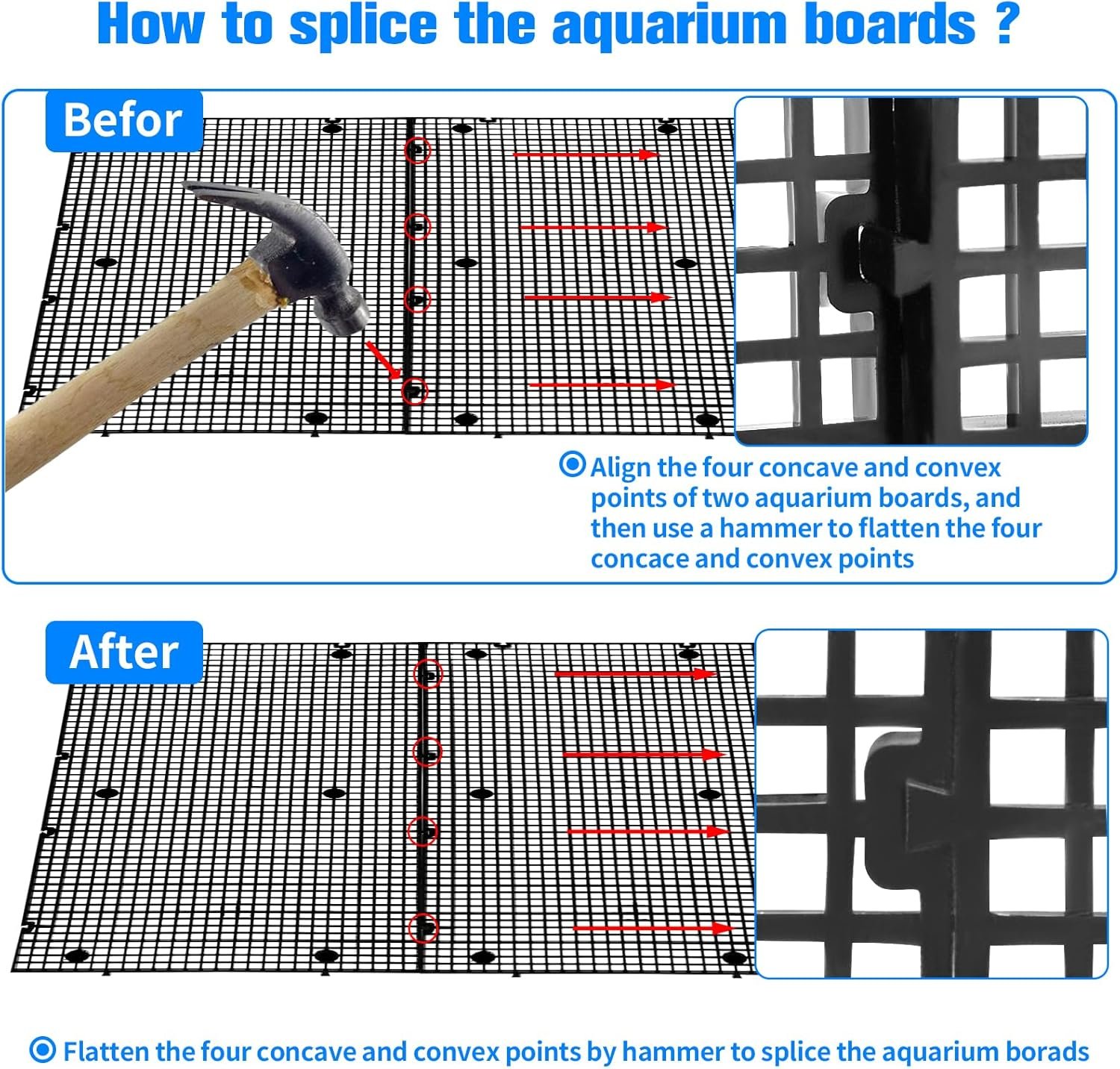 Our aquarium divider separator kit includes 12pcs black aquarium divider and fish tank divider board size is 11.8 Inch X 5.9 Inch with 0.15Inch hole. The novel DIY design allows you to freely piece together the concave convex buckles, and cut into the shape you want with scissors according to your tank needs.