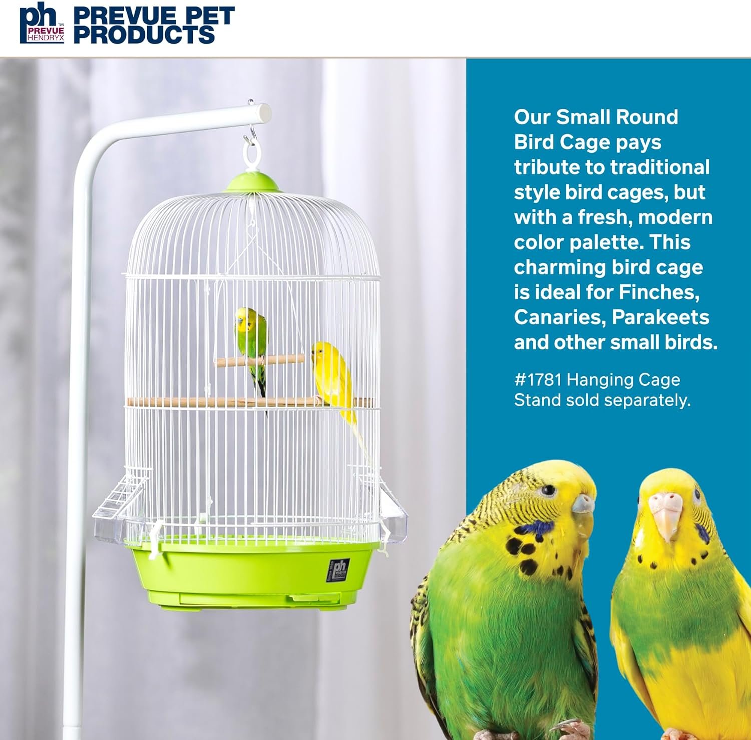 I’ve wanted a hanging cage for a long time. I bought a 5 foot stand first, then ordered 2 round hanging cages. This one at 16 by 26 inches and the other was 16 by 28 inches. I put up the other first, It looked wrong somehow overbalanced, which it was physically and not pleasing to look at even tho the cage was beautiful. After 1 week I took it down and hung this cage, the 16 b y 26 inch one . I got the one with the light green bottem, and because it was so inexpensive I was afraid it would be difficult to put together. I also expected it to look to small. Putting it together was a breeze. Took me about 15 mins and that include stopping for some tea. When ihung it from the stand it looked perfect. Lovely cage and perfectly sized with the stand. It did not look at tho it would fall over at second. It has plenty of room for a few to toys which I plan to change out regularily. I was afraid the green would like look a hippie or toddler cage, but it looks lovely. Its light enough, and not glaring green. And it is light, the other cage only sl ightly larger was quite heavy, It took two of us to remove it from the stand, no admittedly we both had suffered injury to our arms and so were not working as good as we should. This Prevue cage will sit on the stand and buy another stand it will be for another prevue round hanging cage. If you want a hanging cage I highly recommend it .