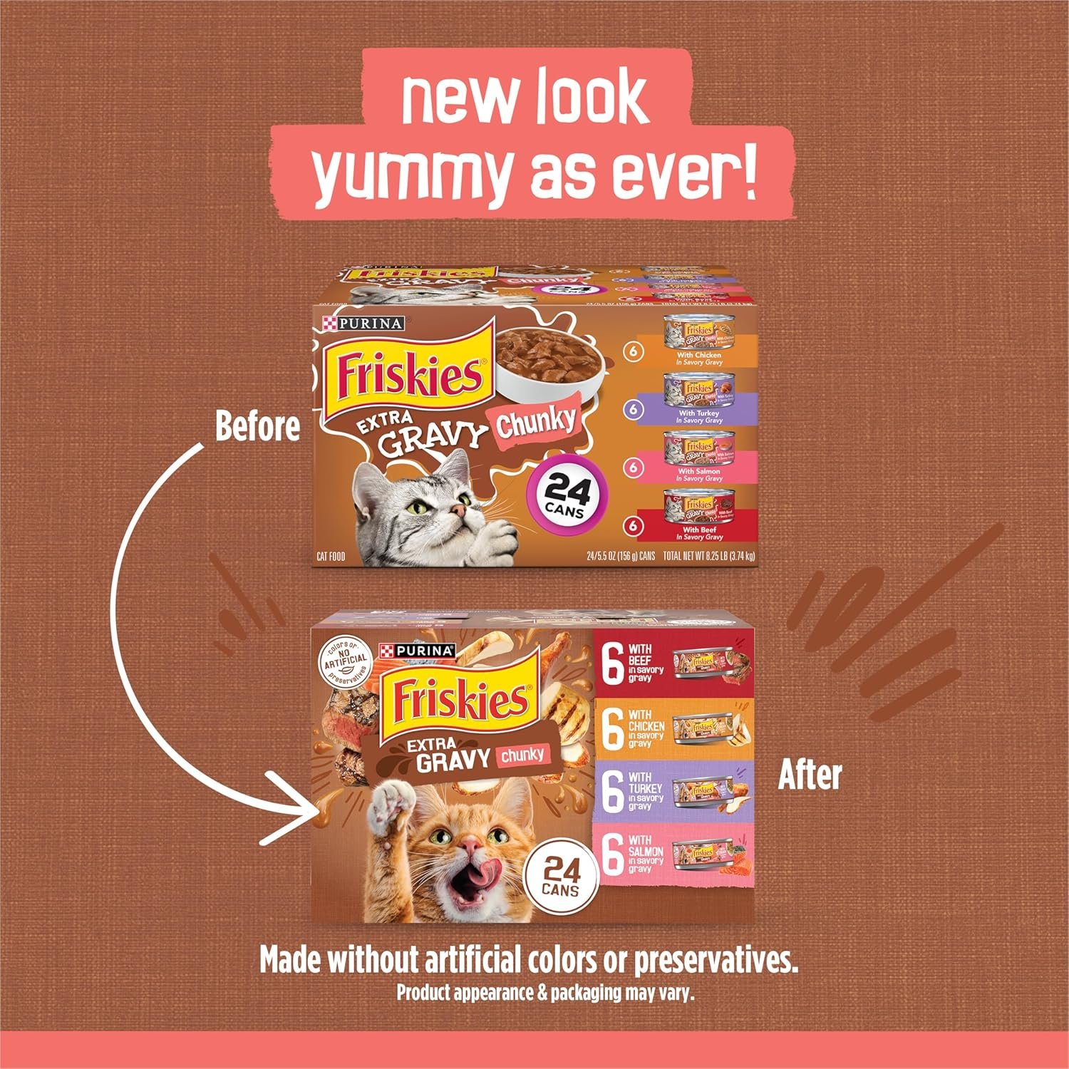 Purina Friskies Extra Gravy Chunky wet cat food variety pack is designed to give your cat one more reason to lick her whiskers at mealtime. With four mouthwatering recipes to choose from, each can delivers the variety adventure-loving cats crave. Made with real meat, poultry, or seafood, these wet cat food entrees are packed with flavors your cat loves. The extra savory gravy adds flavor, tempting your cat to lick her dish clean at feeding time.