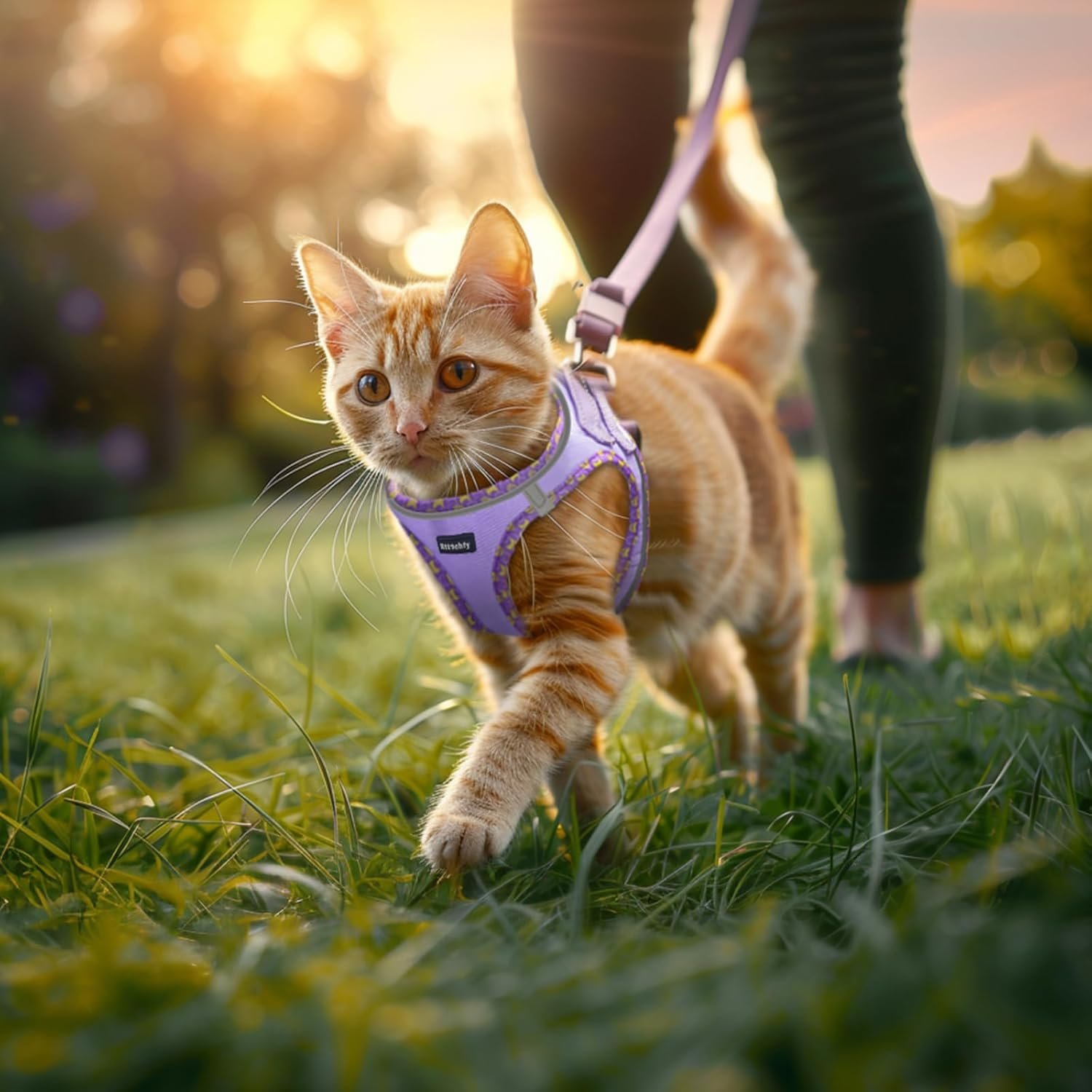 The kitten harness is made from soft mesh fabric, providing breathability and keeping your cat cool during outdoor and indoor activities. The reflective material on the straps ensures a safe walk, day and night, and the metal D-ring keeps your cat under control. The leash handle features a mesh lining, making it more breathable and comfortable to hold.