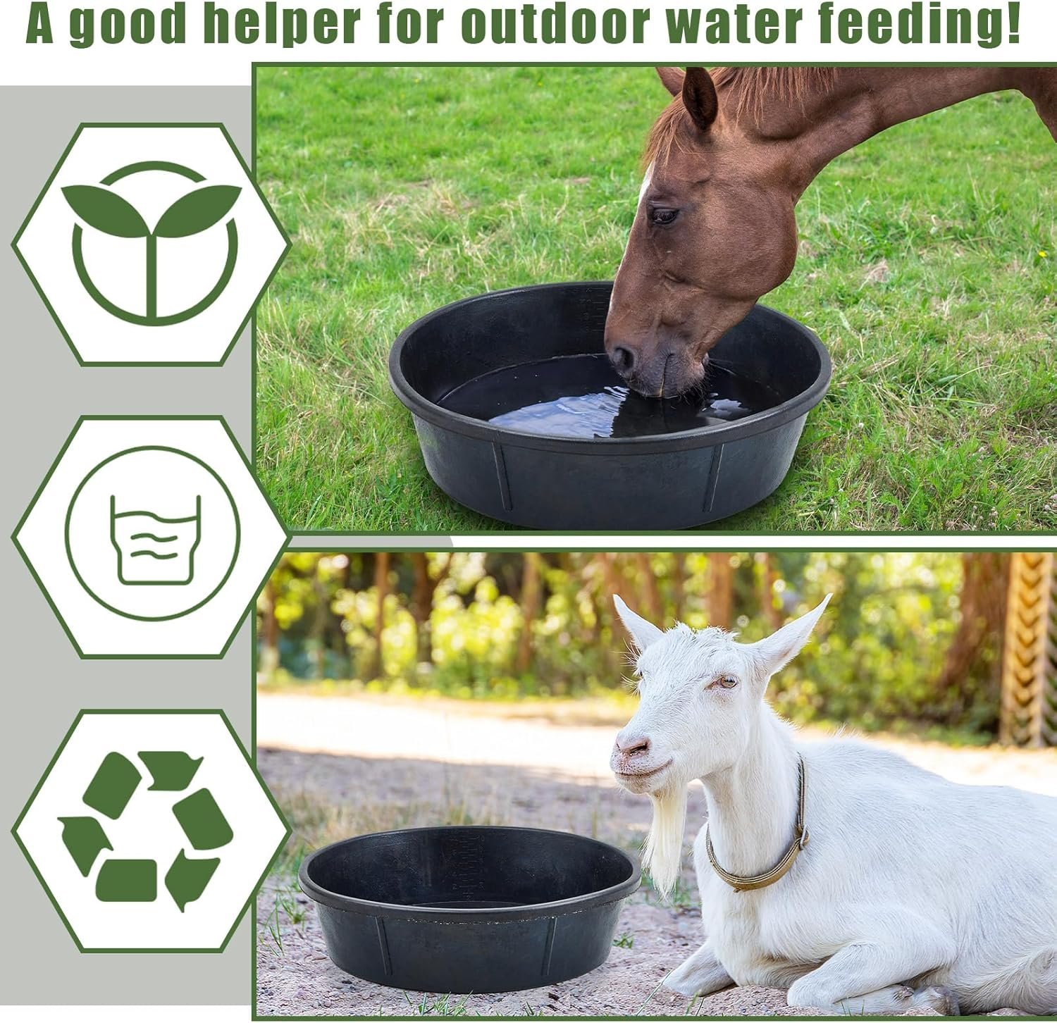 The rubber feed pans are designed to provide a reliable and sturdy feeding solution for various animals, including horses, chickens, ducks, goats, pigs, and dogs. These heavy and thick pans are less likely to tip over or be kicked over, making them a great option for medium-sized animals. With a wide range of applications, they offer a versatile feeding solution for farms, zoos, or pet lovers.