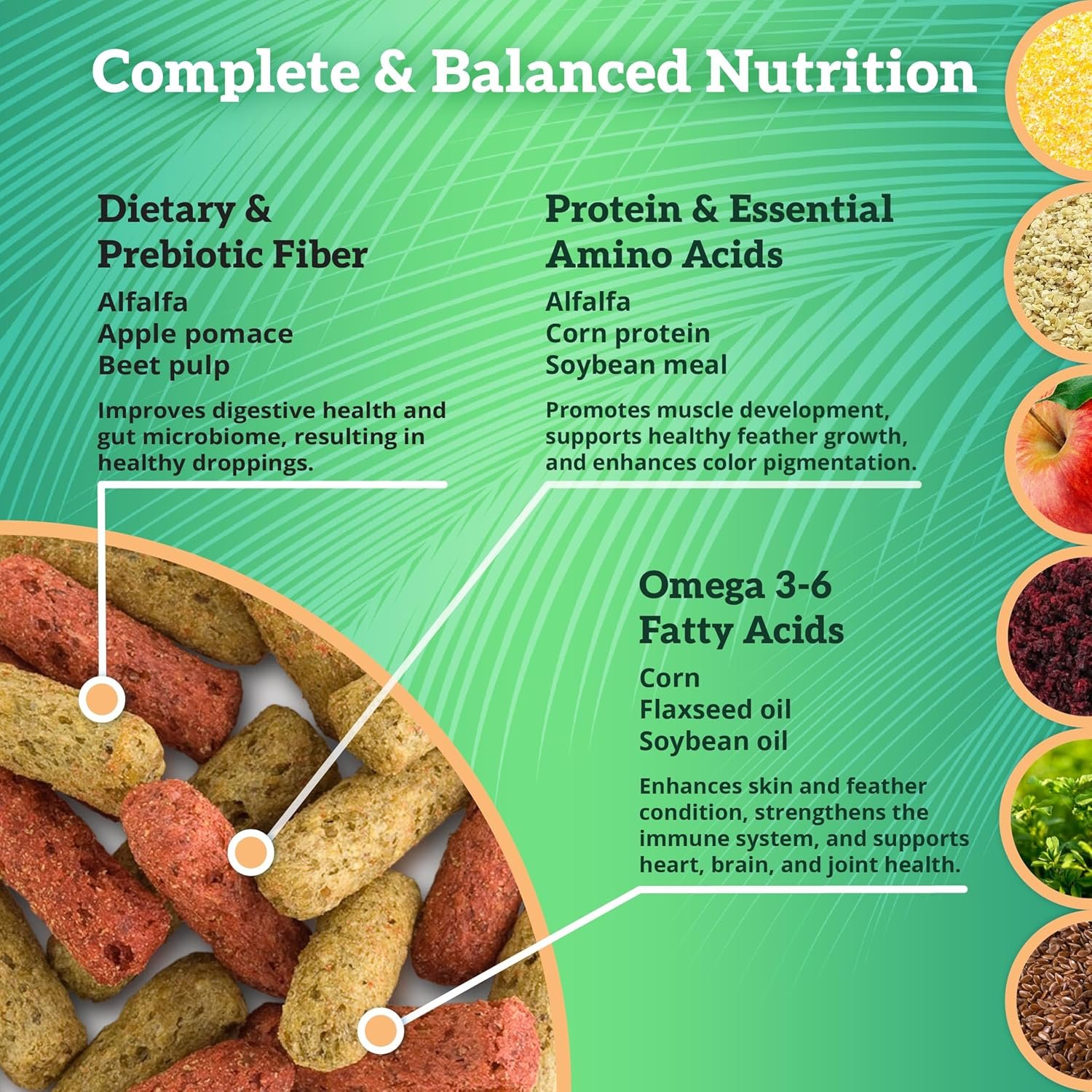 Scenic Jungle Food is a complete and balanced parrot diet, specifically designed for medium and large-sized parrots, including Macaws, African Greys, Cockatoos, Amazons, and other large parrots. With its 1-inch long pellets, it provides essential nutrients, vitamins, minerals, and amino acids, and double the protein of other options.
