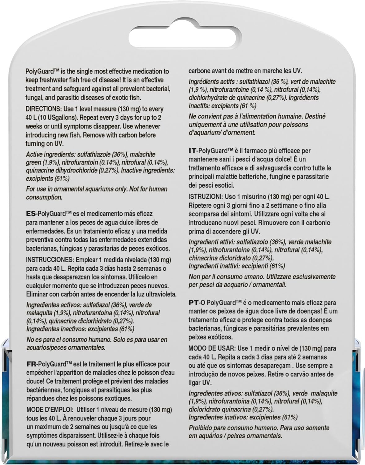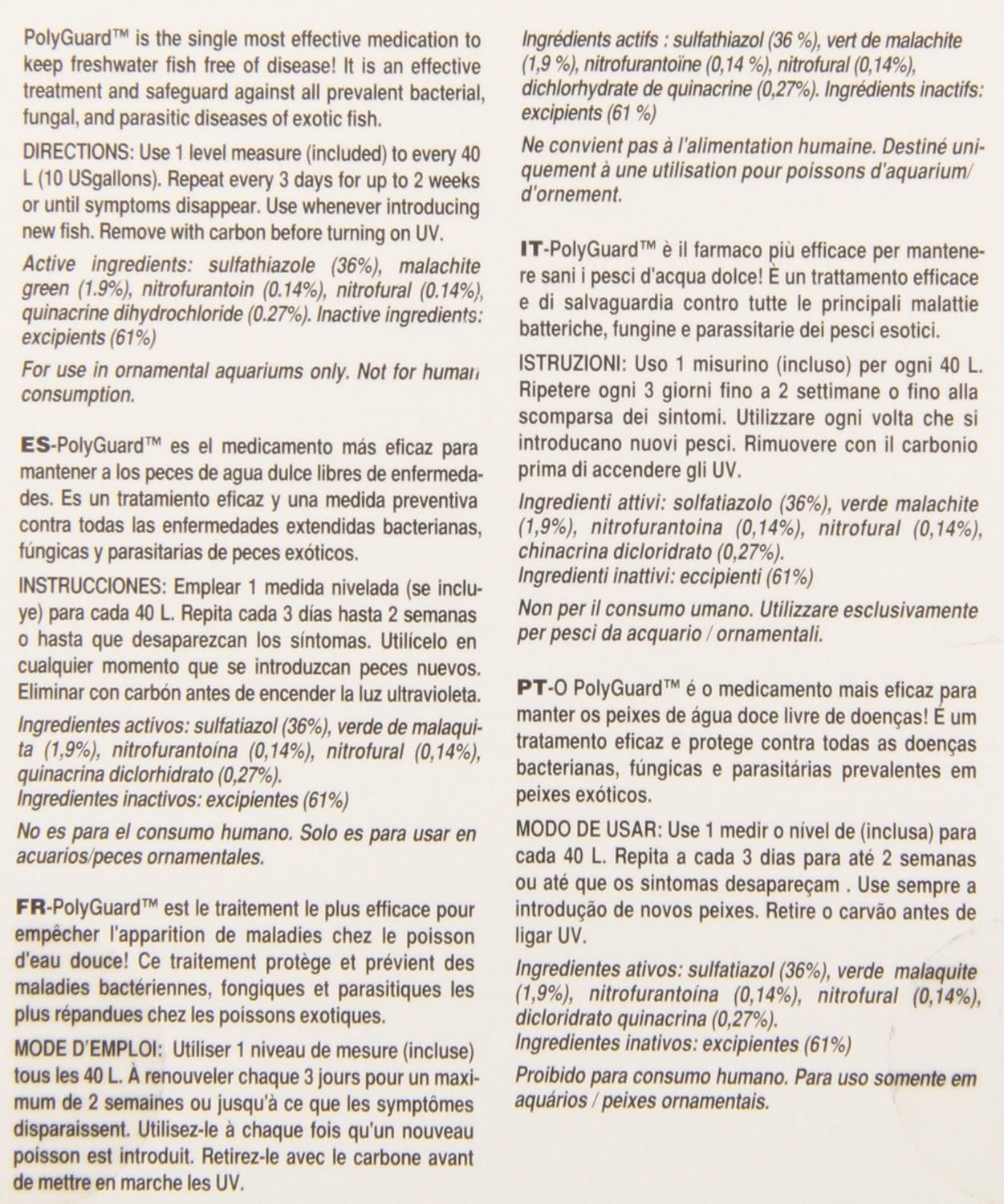 PolyGuard is a highly effective medication designed to keep freshwater fish free from disease. It is a broad-spectrum treatment that safeguards against all prevalent bacterial, fungal, and parasitic diseases affecting exotic fish. This medication can be used in both freshwater and marine aquaria, but it is specifically recommended for the treatment of certain diseases in marine and freshwater fish only.