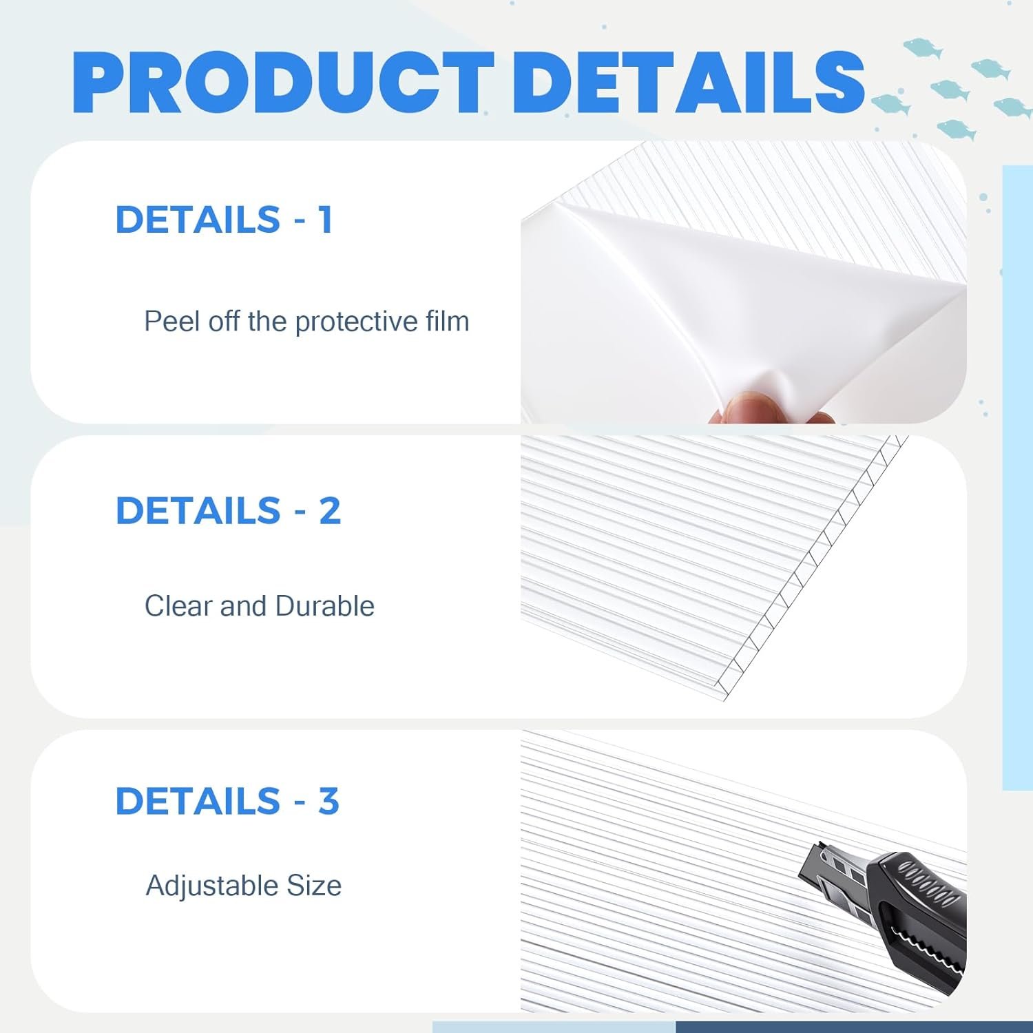 The aquarium canopy is designed with ease of use and maintenance in mind. Its polycarbonate greenhouse panels composition makes it resistant to dirt and easy to clean. The clear and transparent material allows for easy spotting and cleaning of any dirt buildup, ensuring a clean environment for your aquatic pets.