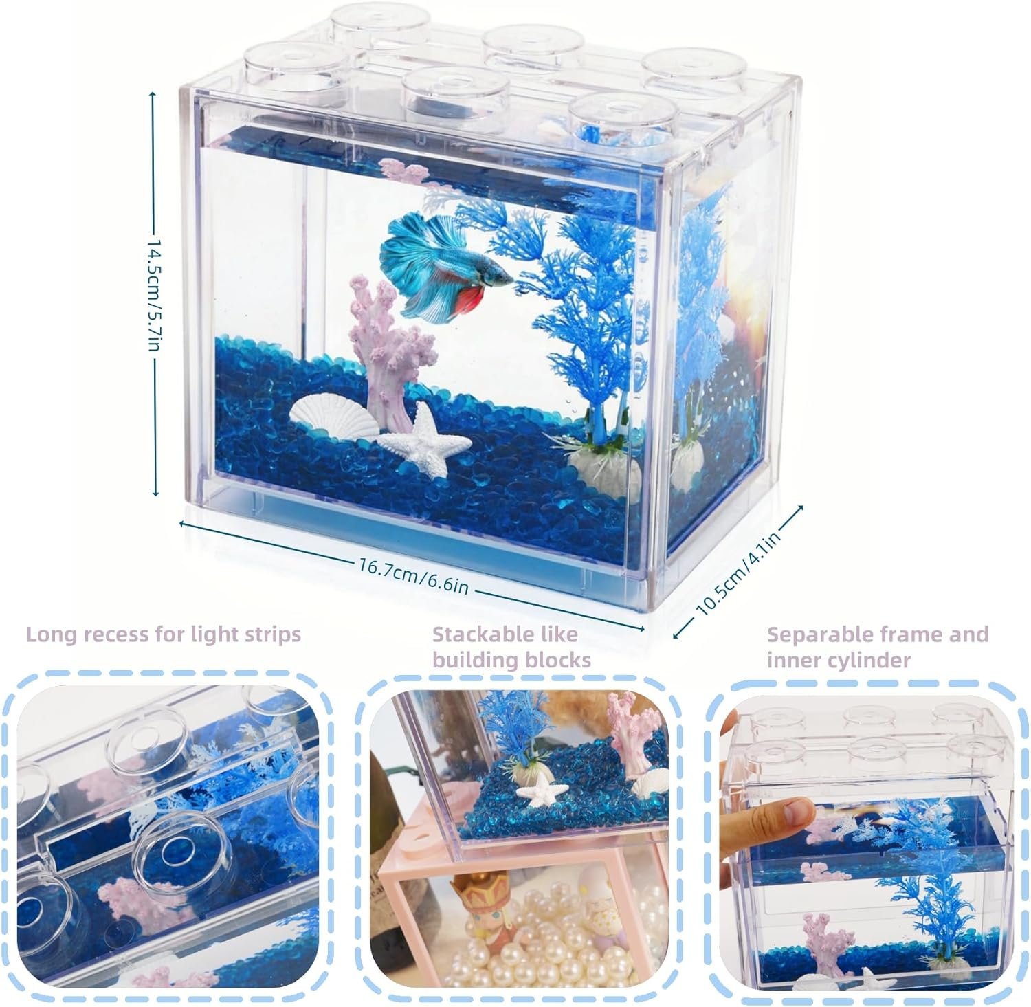 The Miniature Building Blocks Fish Tank is a unique and creative aquarium designed for small spaces. With its 6 protruding columns at the top, it can be securely stacked together with other tanks to create different shapes and decorate your dining table and walls. The outer frame and inner tank can be separated, with the outer frame being brightly colored and the transparent inner tank providing a clear view of the marine world inside.