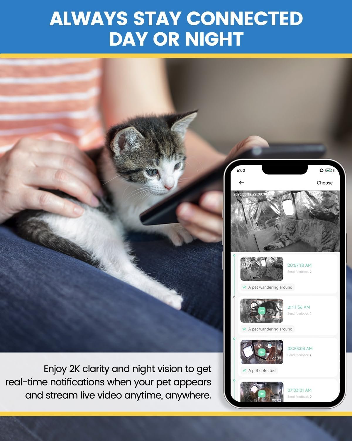 • Peace of mind: Stay connected with your pets and keep an eye on them from anywhere