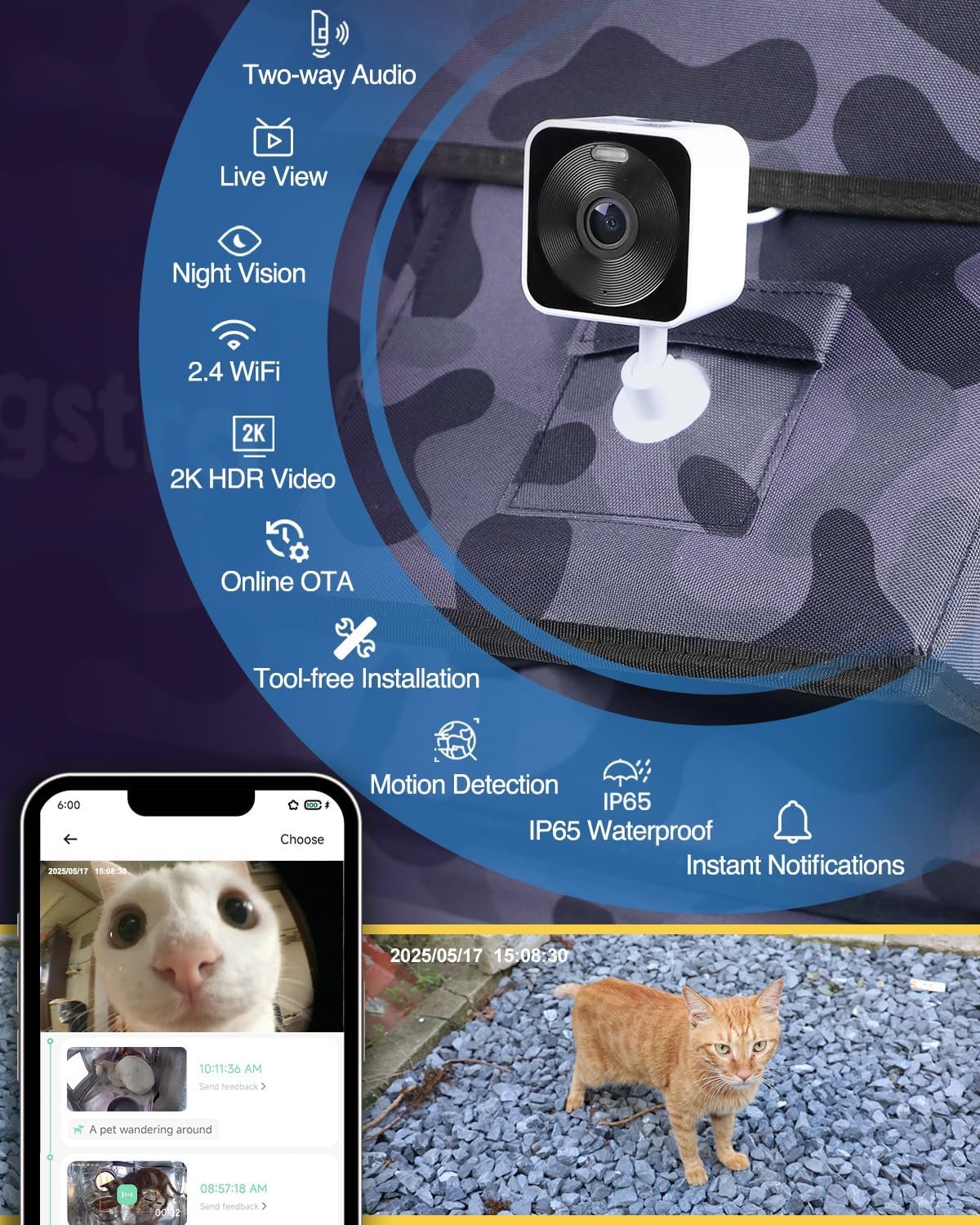 Home Cats Smart Security Camera – 2K HD WiFi Pet Camera with Motion Detection, Night Vision, 2-Way Audio, Cloud & SD Card Storage, Compatible with Alexa & Phone App