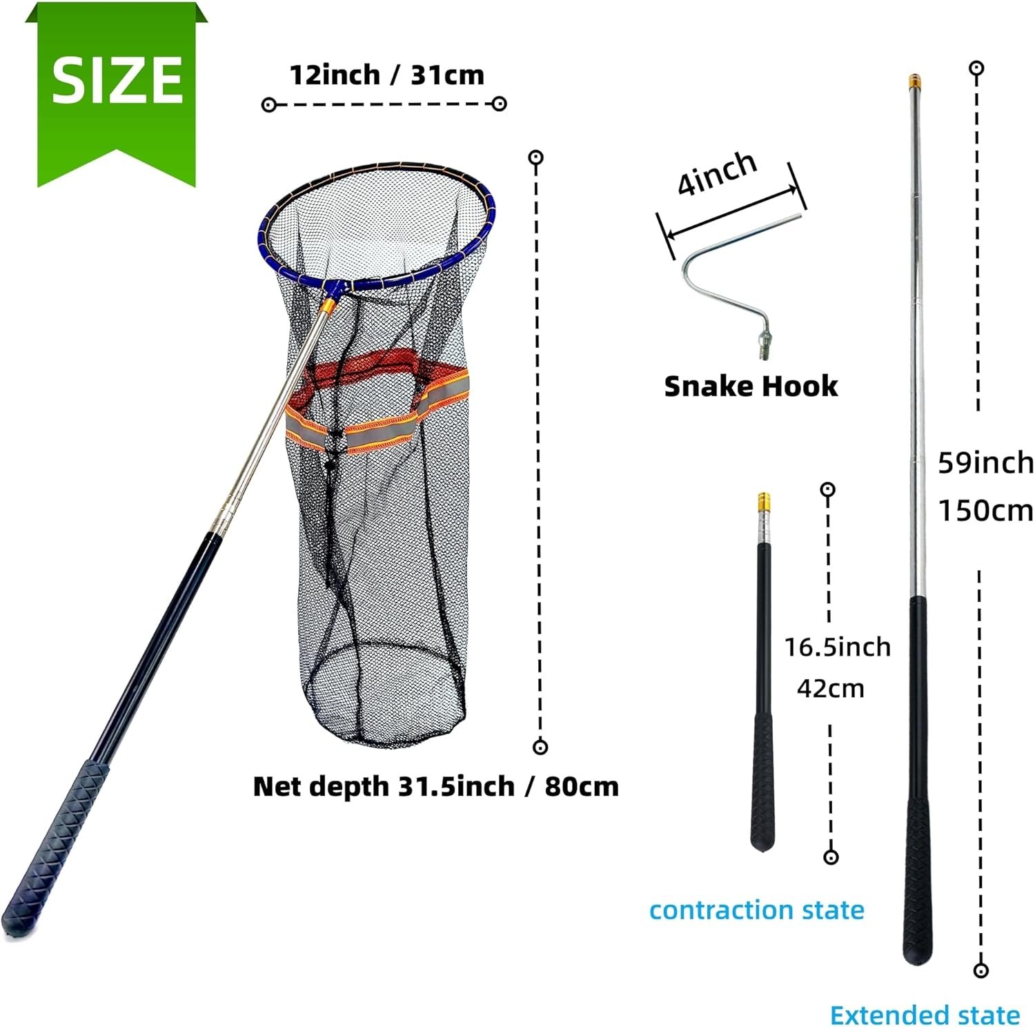 - Extendable pole: The snake removing net pole can extend from 28" to 71", ensuring safe catching and handling of snakes.
