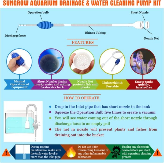 The SunGrow Aquarium Cleaning Pump for your freshwater fish is a siphon system designed to make changing your tank water quick and efficient. Our durable, lightweight tubing reaches deep into aquarium corners so your hands stay dry. The system easily assembles for use in just minutes and disassembles just as quickly.