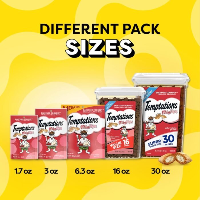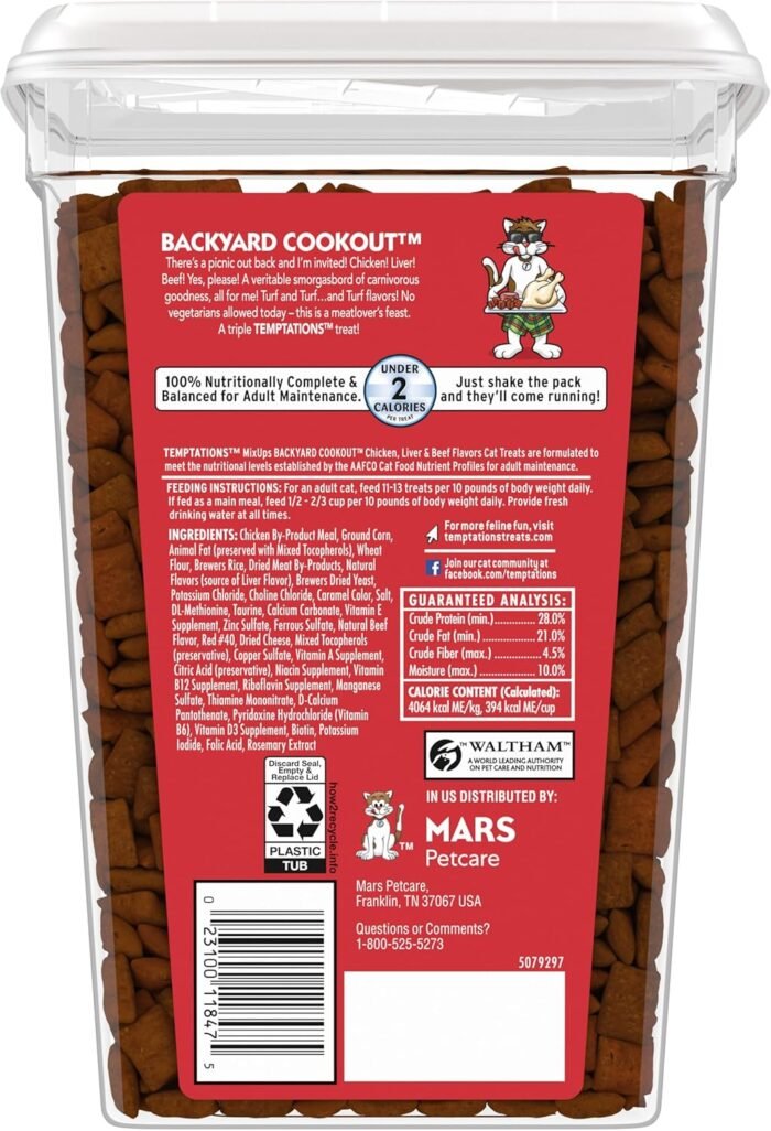 Cats go crazy for the mix of flavors and textures in these tasty treats. With less than 2 calories per treat, you can feel good about rewarding your cat daily. The resealable tub is convenient and keeps treats fresh. Whether you’re looking for a special treat or a fun way to play with your cat, Temptations MixUps Backyard Cookout Cat Treats are the purr-fect choice.
