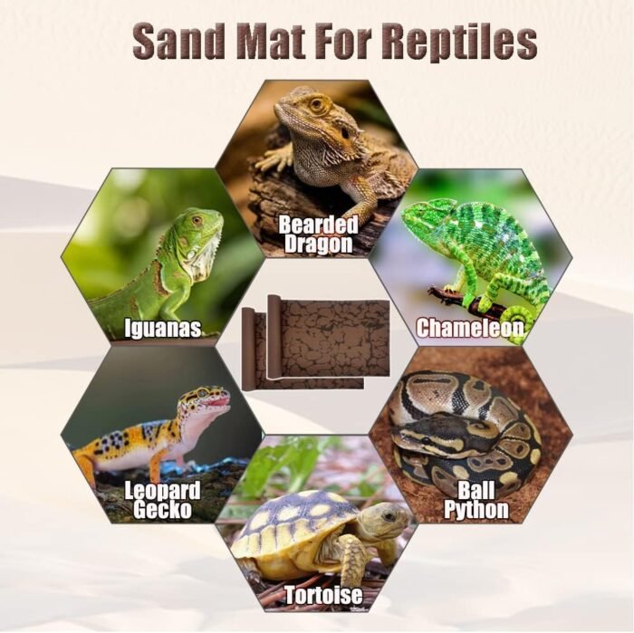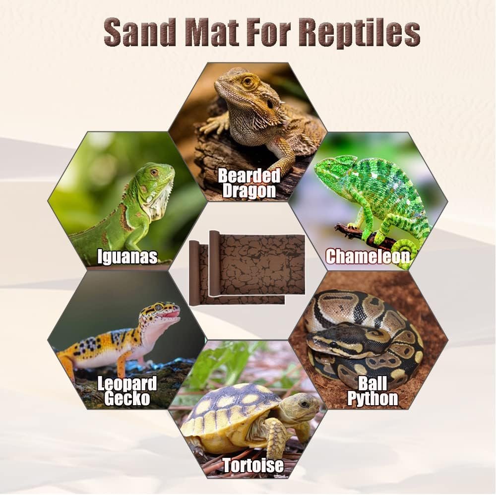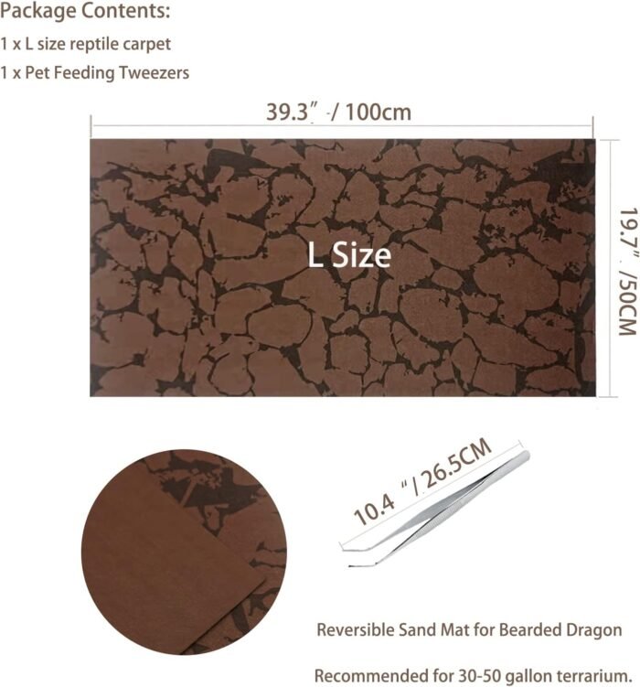 The Reptile Carpet Sand Mat is made from high-quality, non-abrasive, and breathable materials. The surface is smooth, preventing injury to reptiles, and the mat is soft to the touch, comfortable for small animals to walk or rest on. The reversible sand mat features a natural rock pattern on one side and a brown desert look on the other, making it a great addition to any tropical desert reptile tank.