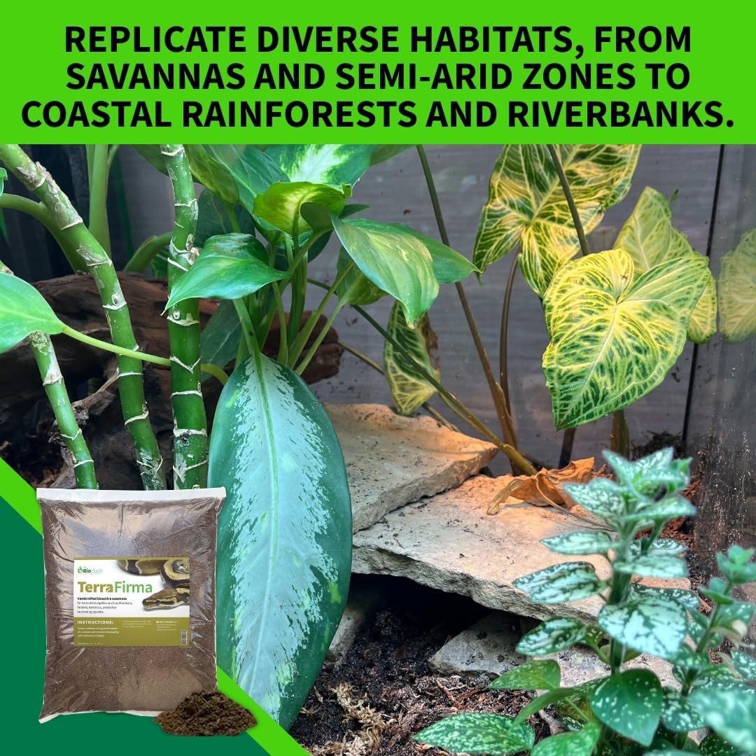 Terra Firma is a unique substrate designed for temperate-dwelling pets, ideal for species from seasonal savannas, semiarid regions, coastal rainforests, and riverbanks. It is best used in tanks with a humidity range of 50-75%.