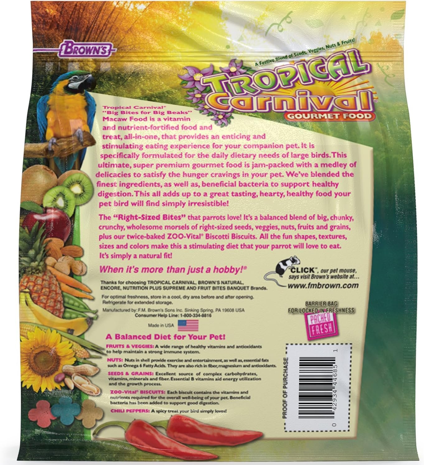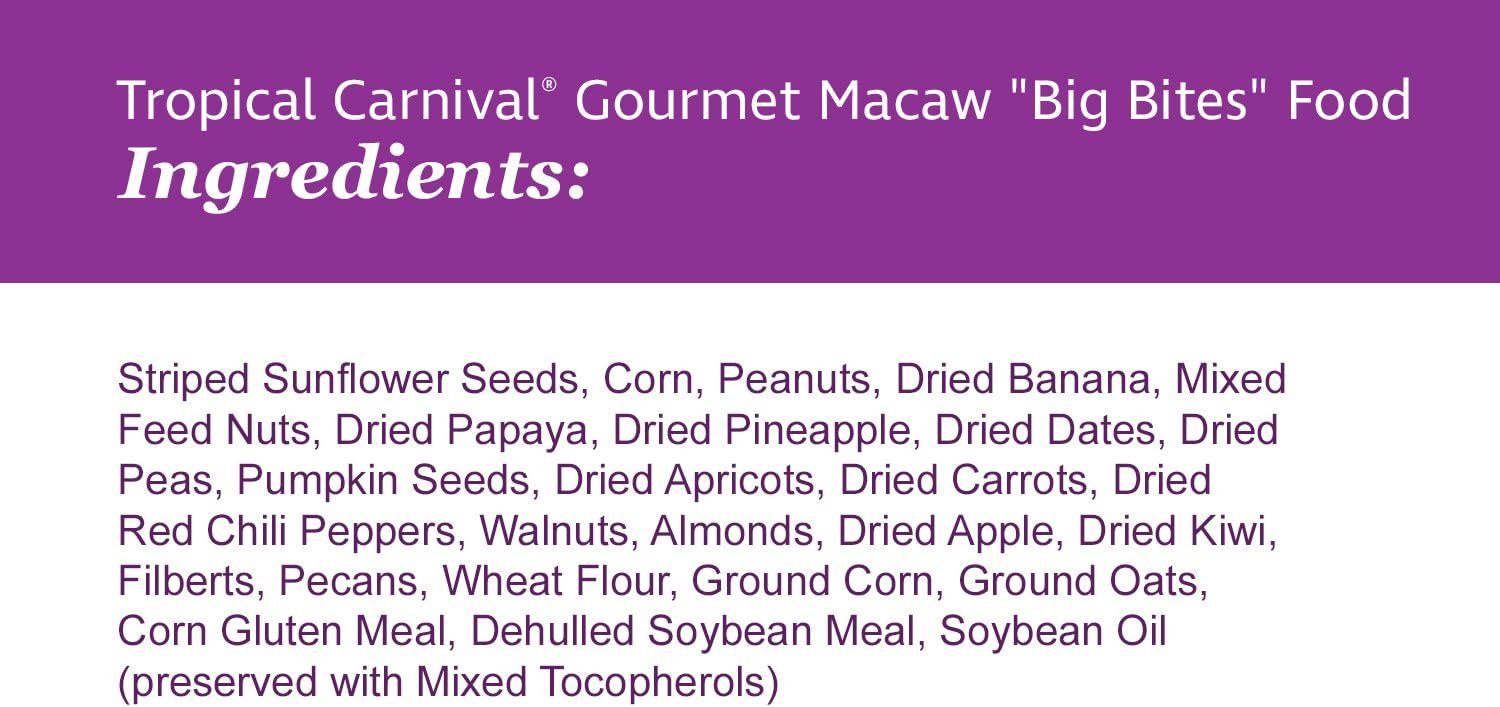 F.M. Brown’s Tropical Carnival, Gourmet Macaw Food Big Bites for Big Beaks, is a vitamin-nutrient fortified daily diet designed specifically for the dietary needs of macaws. This gourmet macaw food is formulated to provide a balanced and nutritious diet, with over 30 unique ingredients, including fruits, vegetables, nuts, and more.