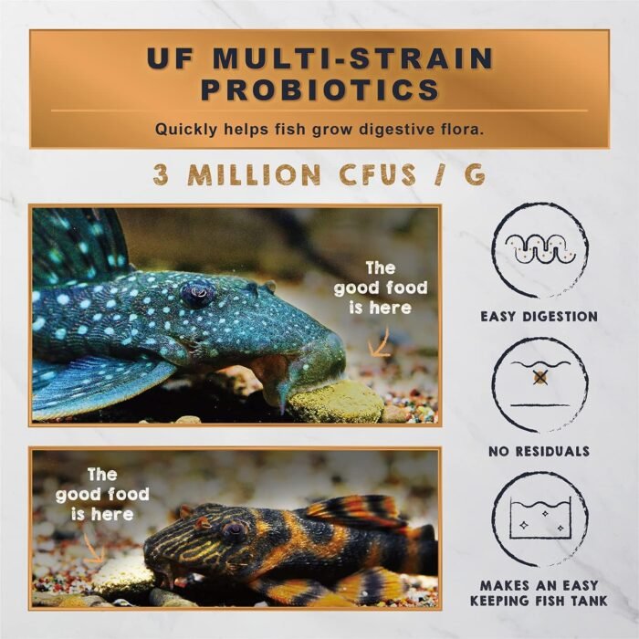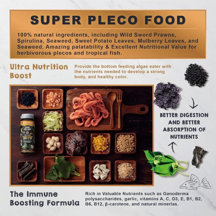 - PET SUPERFOOD: It’s not only tasty, but it also keeps pleco healthy! Our food is jam-packed with vitamins (A, C, D3, E, B1, B2, B6, B12) great for reaching full potential in size, color, fins, and A+ immunity!