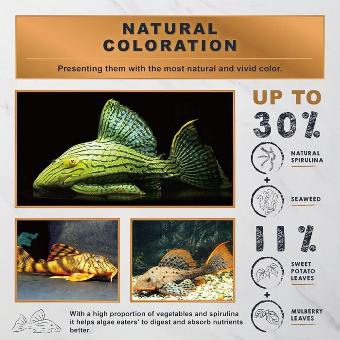 - ALL NATURAL FLAVOR: Formulated with high content of natural spirulina, seaweed, sweet potato leaves, mulberry leaves, wild sword prawns, garlic and a variety of carefully selected natural ingredients that delivers superb palatability and well balance nutrients for algae eaters.