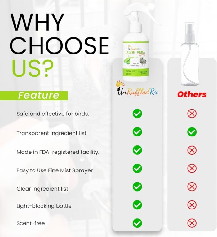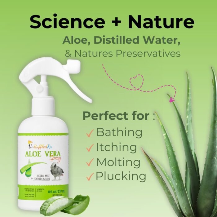 UnRuffledRx Aloe Vera Spray for birds is a thoughtful solution for bird owners seeking a natural, effective, and safe way to care for their pets’ skin and feathers. With its chemical-free formula, soothing properties, and commitment to quality, this spray stands out as a leading product in bird wellness. Whether your bird is experiencing itchy skin, dull feathers, or the stresses of molting, UnRuffledRx Aloe Vera Spray is a worthwhile consideration to promote healthy, happy birds.