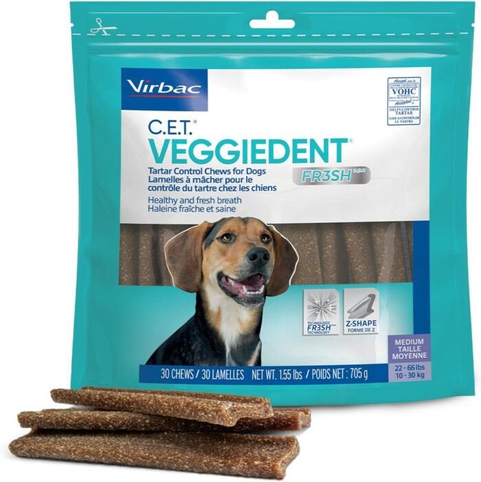CET Veggiedent Fresh Tartar Control Chews are a new innovation from Virbac, offering a 3-way performance that cleans teeth, freshens breath, and supports proper digestion. These chews uniquely target bad breath and support proper digestion for dogs.