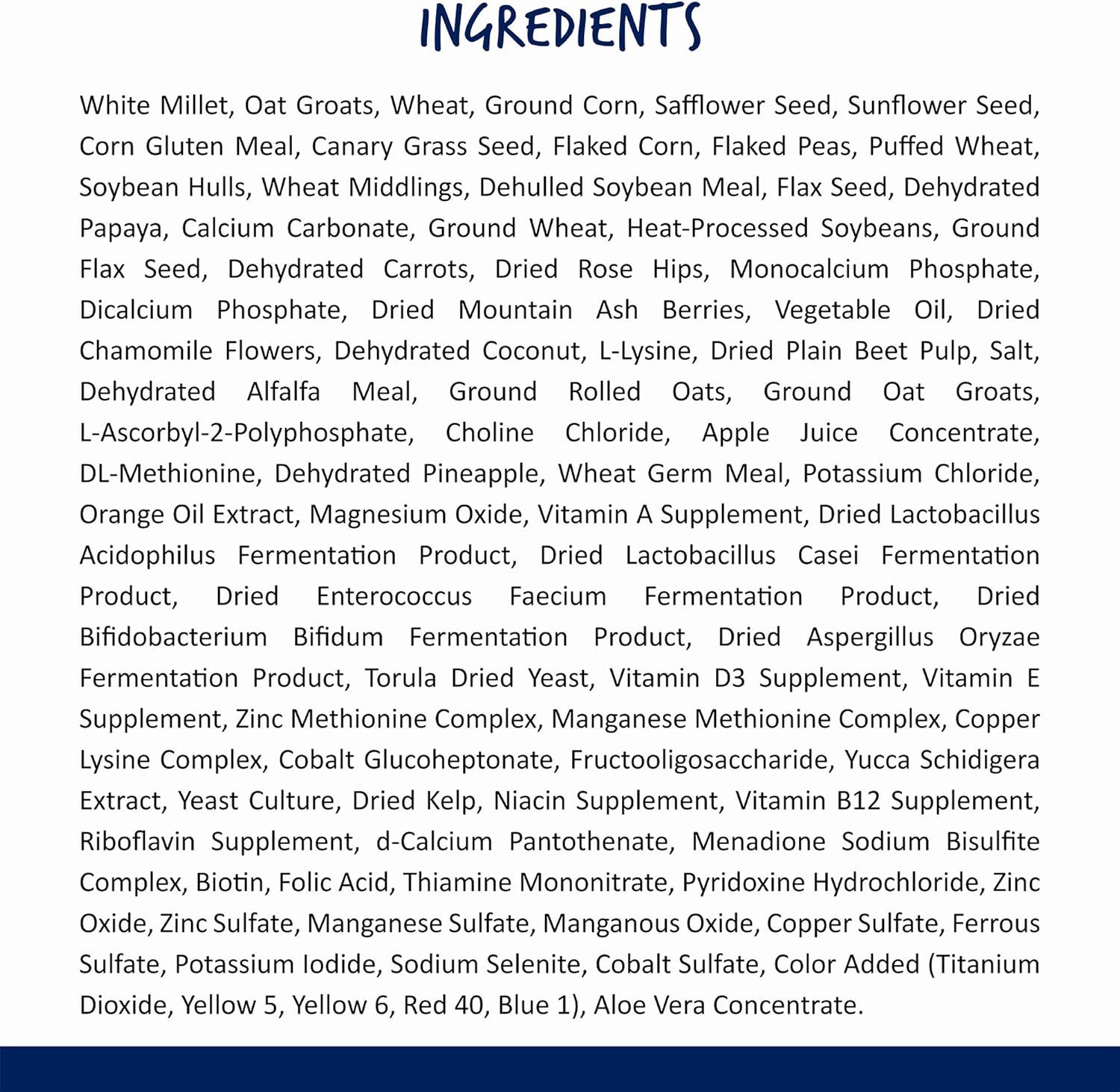 - High-Biodiversity Mix: Includes a wide range of ingredients like millet, sunflower seeds, nutriberries, peas, papaya, carrots, coconut, and pineapple to simulate a natural diet.