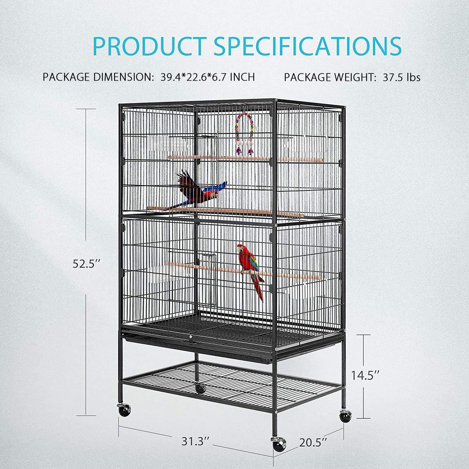 Made of low-carbon steel, which is rust-proof and water-resistant, and the latches are strong and durable. 2-cage-doors design prevents your birds from escaping. Steel wires are evenly spaced to ensure safety and meet ornamental value at the same time.