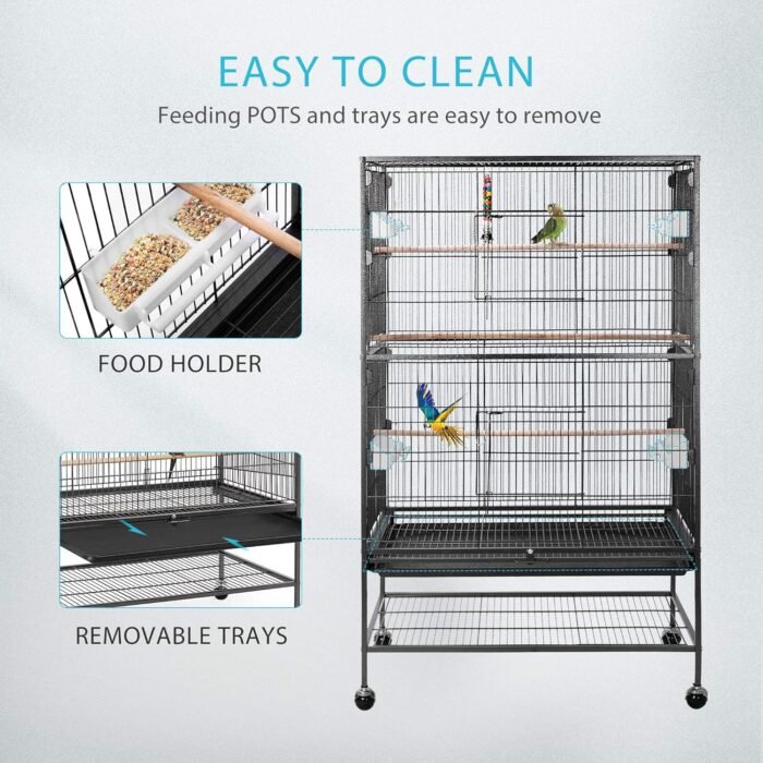 To clean the bottom of this birdcage, all you need to do is to slide out the bottom tray and wash it off. Additionally, all shelving can be easily removed for easy cleaning, so as to keep a clean and tidy environment as well as keep your pets safe.