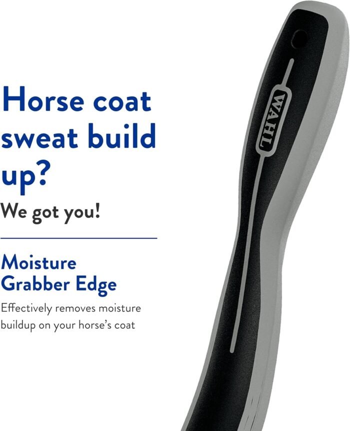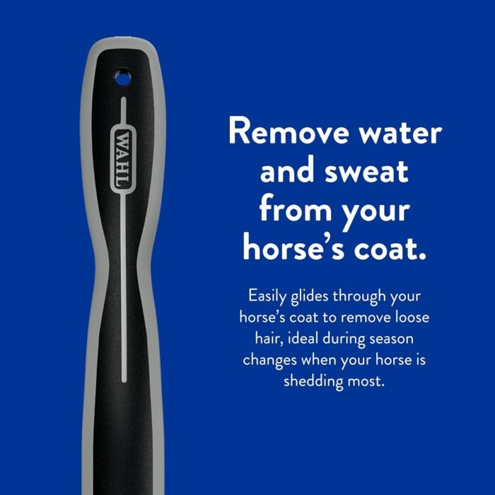 Wahl’s Sweat Scraper is a grooming tool designed to easily remove water and sweat from your horse’s coat. The tool features a Moisture Grabber Edge that effectively removes moisture buildup, ensuring your horse’s coat remains dry and healthy. The comfortable rubber grip provides an enjoyable grooming experience for both you and your horse.