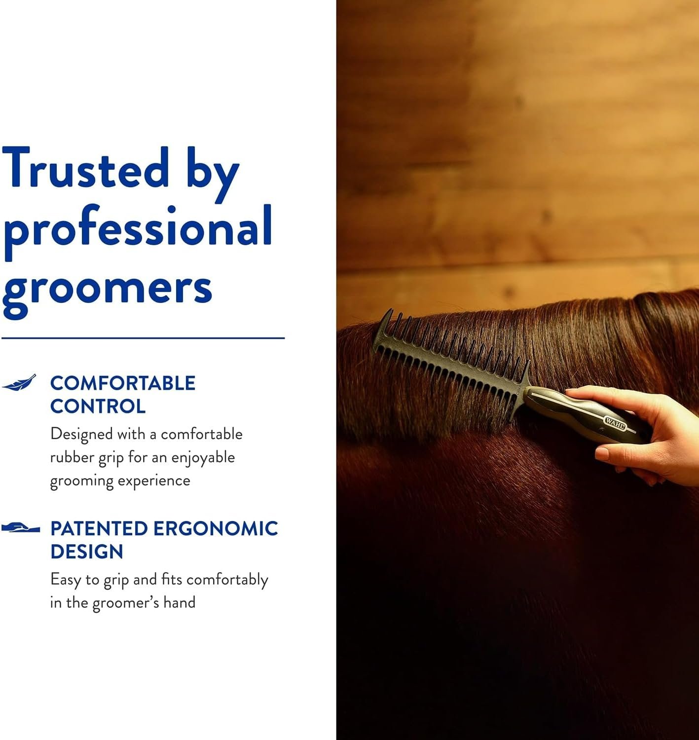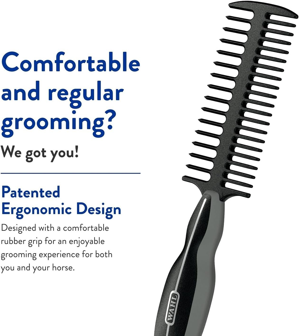 This horse grooming comb is designed for utmost comfort and usability, featuring a soft, patented ergonomic rubber grip for easy handling. It is a must-have tool to detangle and separate the mane and tail of your equine companion, making the grooming process effortless and enjoyable for both you and your horse.