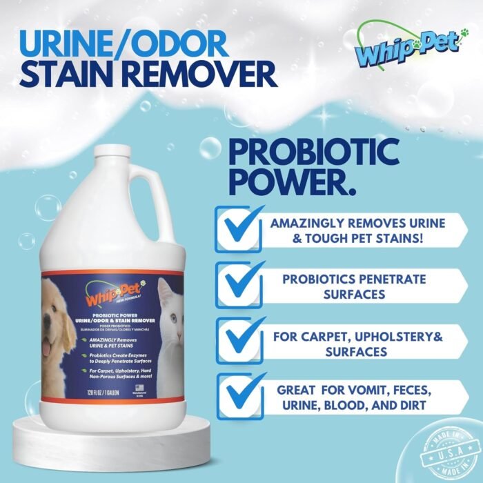The Whip It Pet Stain and Odor Remover is a powerful, enzymatic-based formula that removes pet stains and odors quickly and effectively. The product contains natural enzymatic bacteria that break up and dissolve uric acid crystals in urine, eliminating the source of the odor. It is versatile and can be used on all types of flooring, artificial grass, laundry, bedding, and clothing. The formula also helps prevent pets from repeat marking, making it a great solution for pet owners. With its fast-acting and easy-to-use design, the Whip It Pet Stain and Odor Remover is a great addition to any pet owner’s cleaning arsenal.