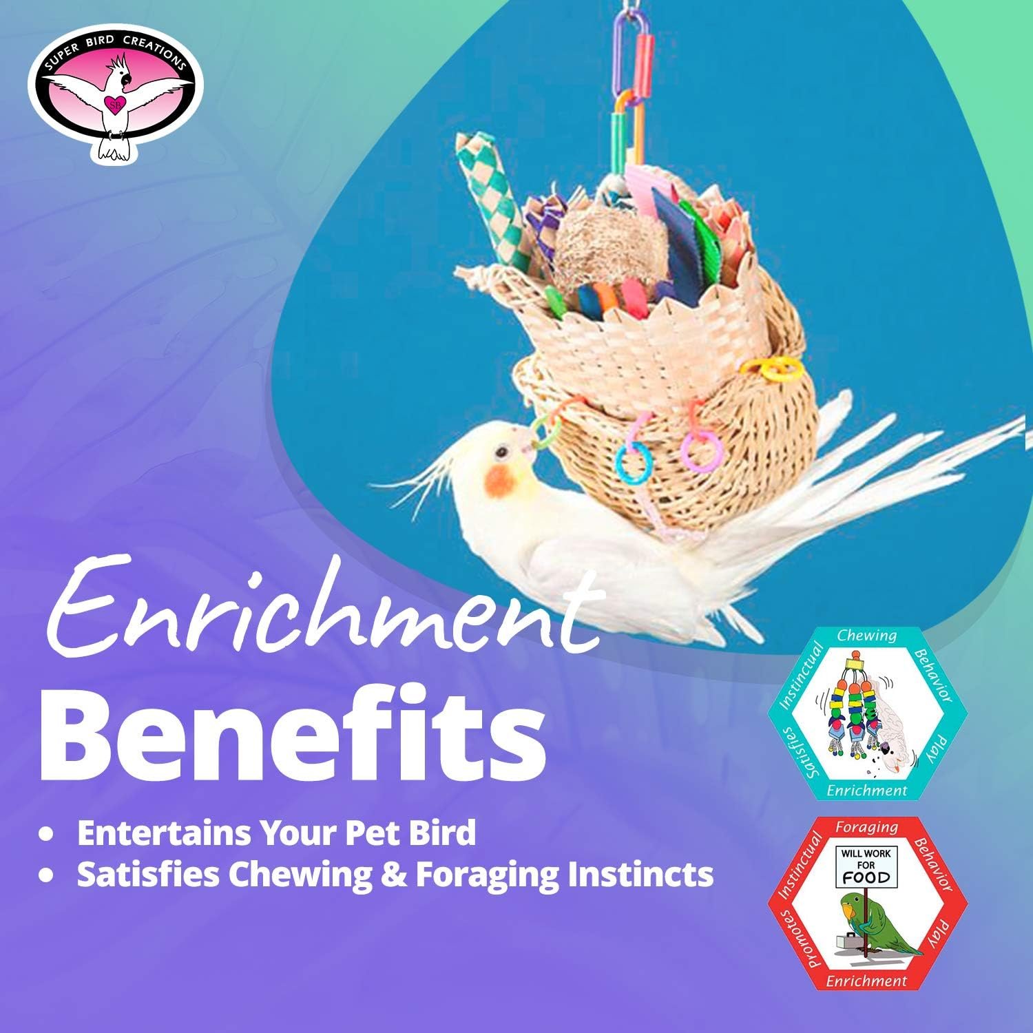 - Satisfies a bird’s innate desire to chew and forage, promoting essential natural behaviors and providing mental stimulation