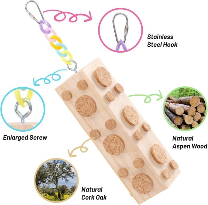 The 2 Pcs Wooden Bird Chew Toys are designed to provide your parakeet, cockatiel, conure, budgie, lovebird, or small to medium bird with a fun and stimulating way to relieve boredom and anxiety. Made from 100% natural materials, including poplar wood and cork oak, these toys are safe for your bird to chew on. The package includes 2 hanging bird chewing toys, 8 replacement large corks, and 12 replacement small corks, totaling 92 corks in all.