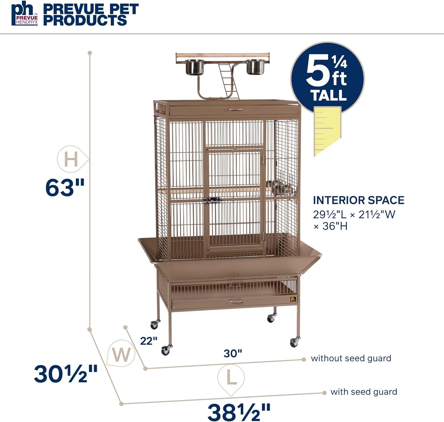 This bird cage is made of durable wrought iron with a non-toxic powder-coated finish, available in a coco brown color. The cage measures 30 inches long, 22 inches wide, and 63 inches high, with 3/4-inch wire spacing.