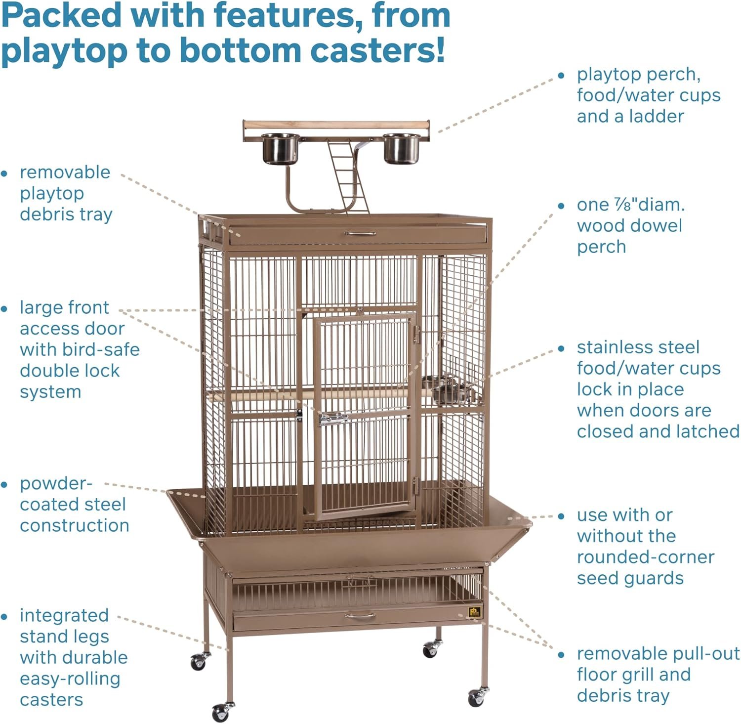 - Includes 4 stainless steel cups, 2 wood perches, cage stand, playtop, and rounded seed guards