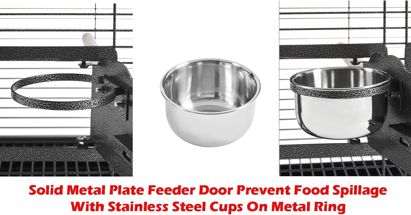 - Convenient Feeding: Features a swing-away solid metal plate feeder door to prevent seed spillage, along with 2 stainless steel bowls on a metal ring.
