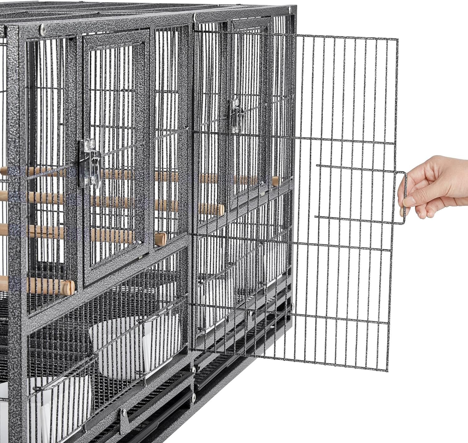 The 2-in-1 cage with a divider allows you to use it as an 18” L flight cage or two separated cubbies for breeding, each with 2 perches, 2 feeders, a lockable door, a side nesting door, a pull-out tray, and a grate.