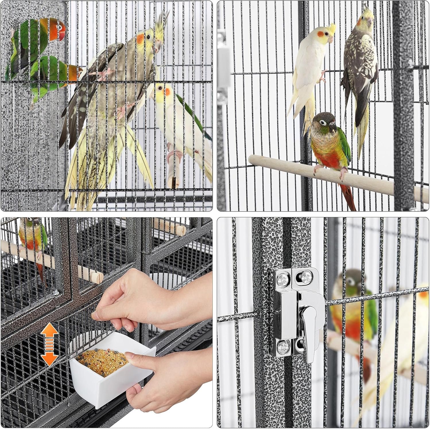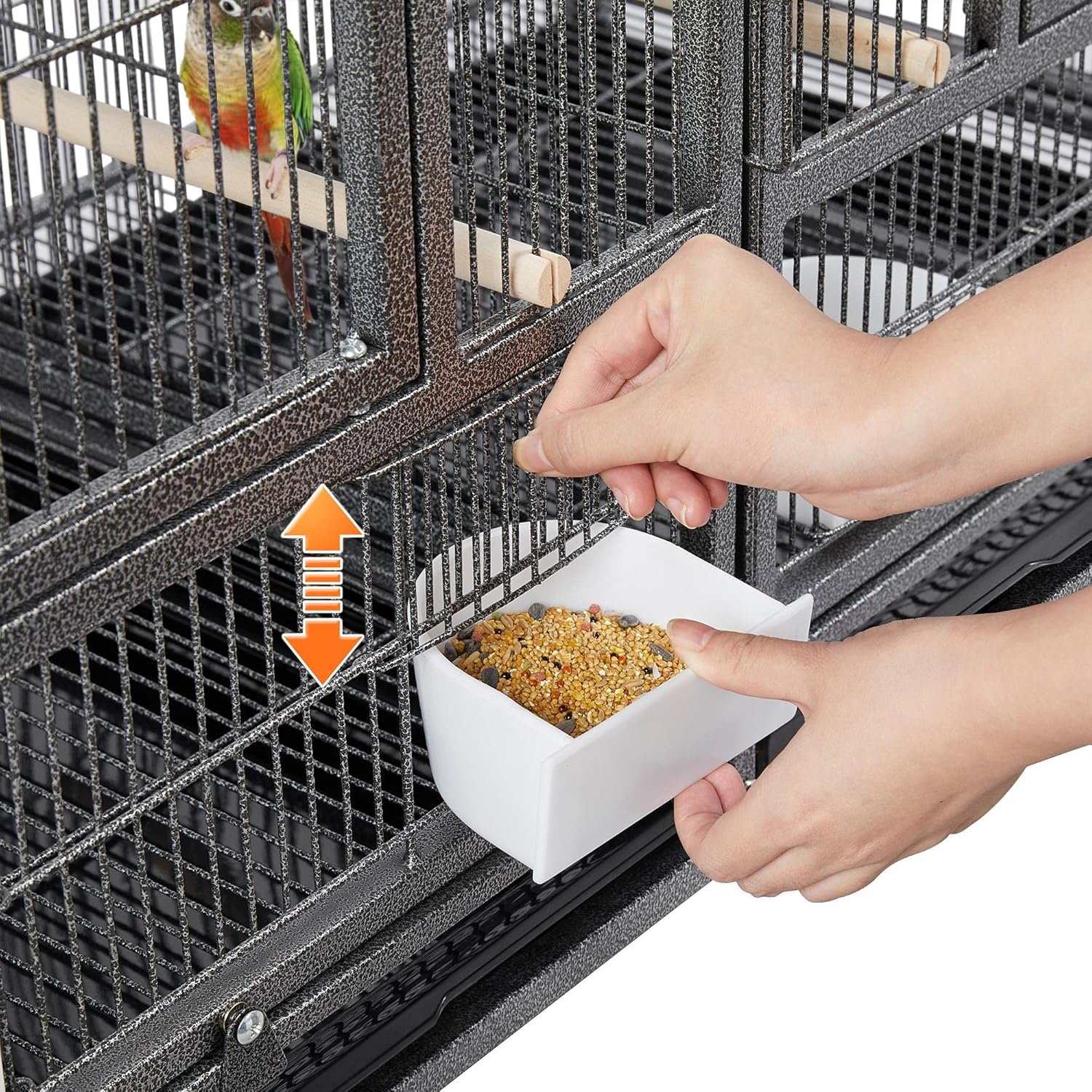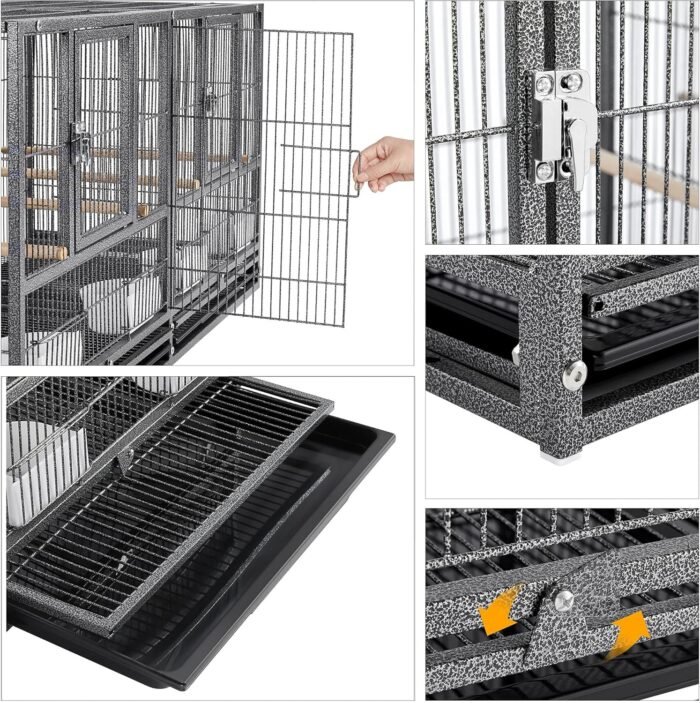 Cleaning is easy with the waterproof finished cage and the bottom slide-out tray, and the pull-out grate at the bottom prevents birds from walking in their excrement.
