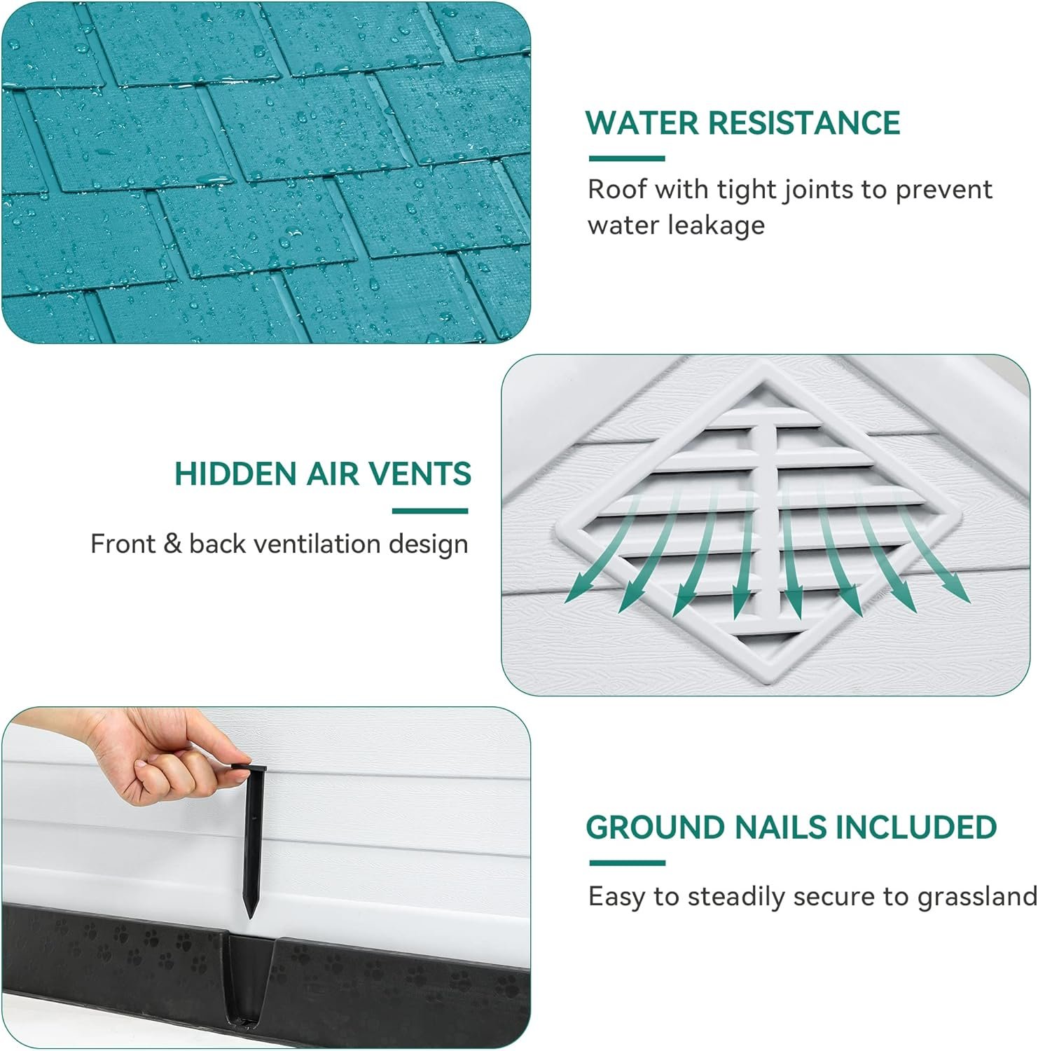 This plastic dog house features overall dimensions of 34.5”L*30.9”W*32”H and a door sized 13”*20.9”, providing a spacious room for pets and dogs such as Pomeranian, French Bulldog, Teddy, etc.