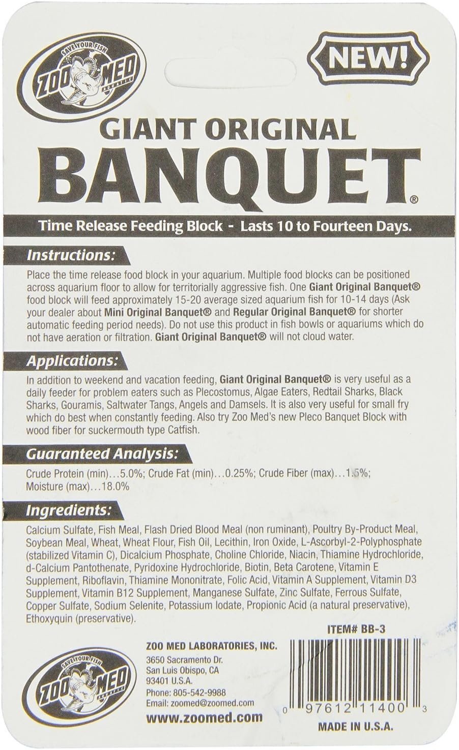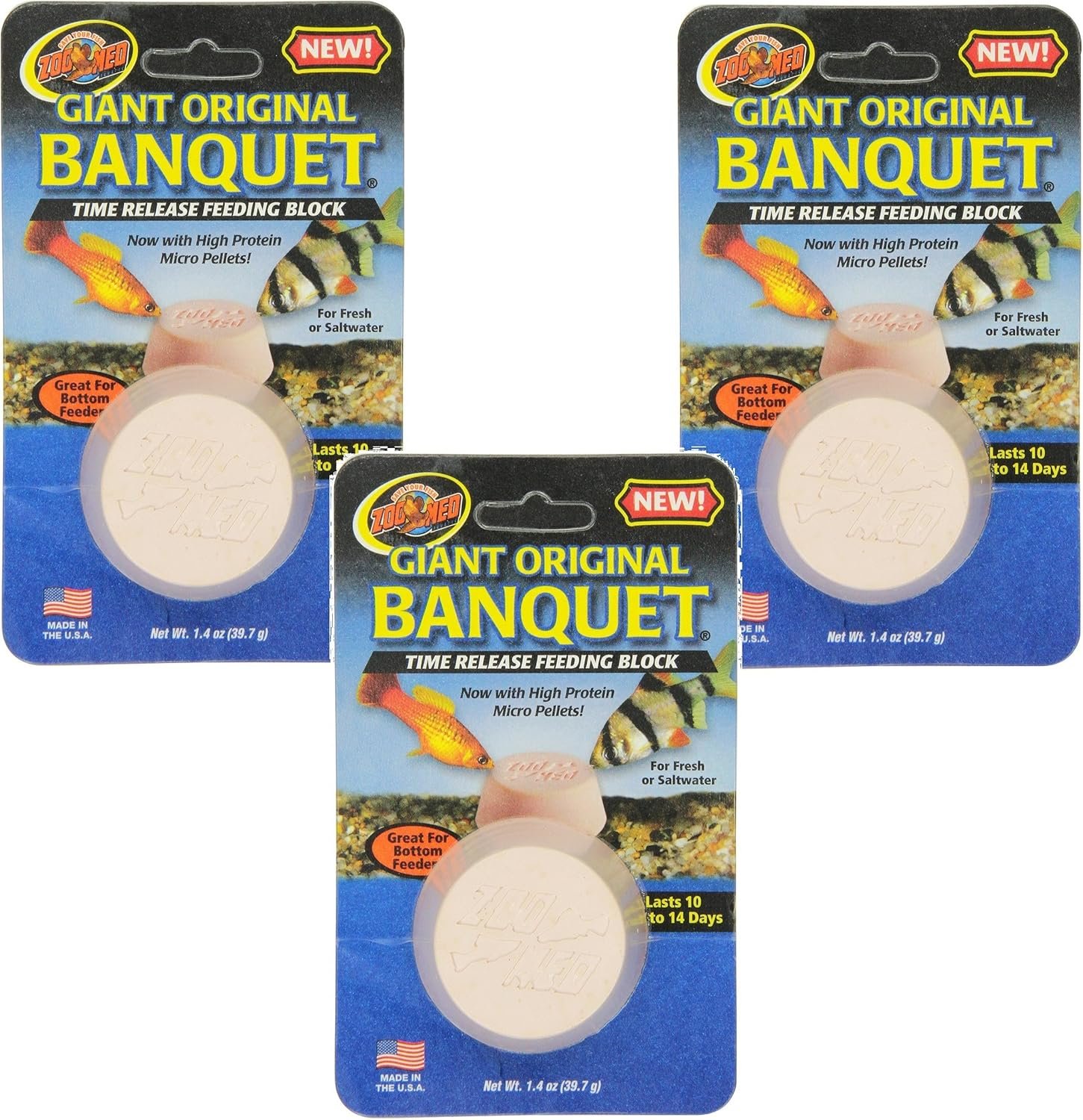 This 3-pack of Zoo Med Laboratories Giant Banquet Block Feeders is a convenient and reliable food source for your aquarium fish. Each block lasts 10 to 14 days and will not cloud the water, making it an ideal solution for weekend and vacation feeding. The Original Banquet blocks are also perfect for small fry, problem feeders, and a variety of fish species, including Plecostomus, Algae Eaters, Redtail Sharks, Gouramis, Saltwater Tangs, Angels, and Damsels.