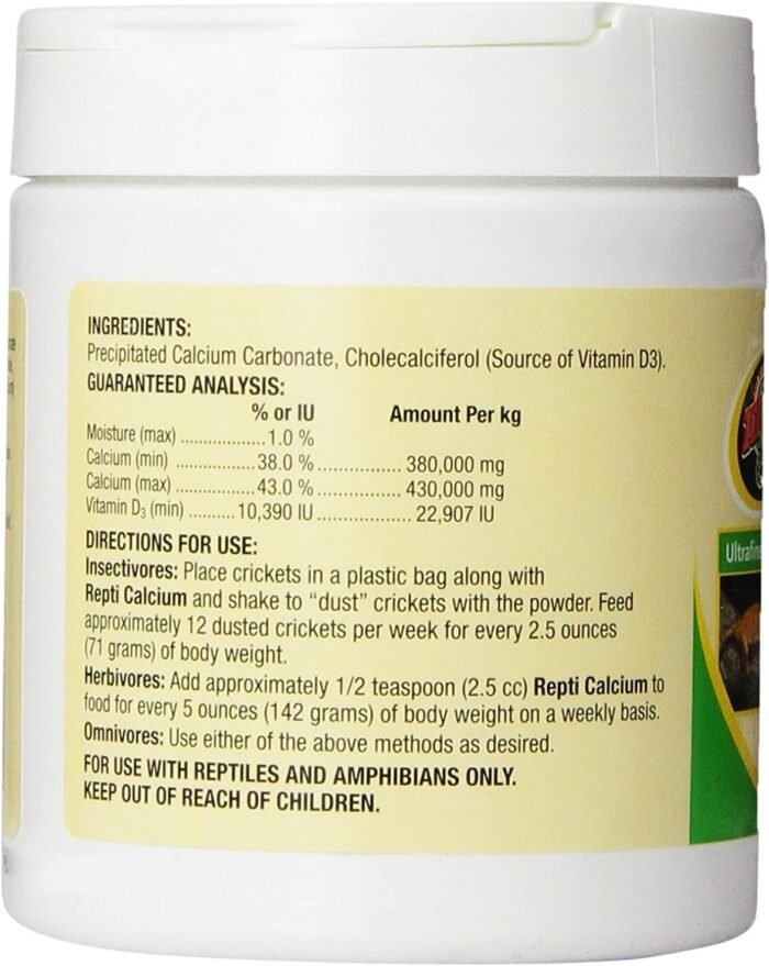 Reptile Calcium is an ultra-fine Precipitated Calcium Carbonate Supplement with Vitamin D3, specifically designed for reptiles and amphibians. It is a phosphorus-free calcium supplement, ensuring a safe and healthy source of calcium for your pets. The unique shape and high surface area per gram of this supplement result in increased calcium bioavailability, making it an excellent choice for reptile and amphibian owners.