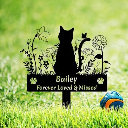 Custom Cat Name Memorial Grave Stake Marker, Personalized Floral Cat Memorial Grave Marker, Customized Flowers Butterfly Cat Memorial Stake Outdoor Metal Grave Plaque Cat Memorial Statue